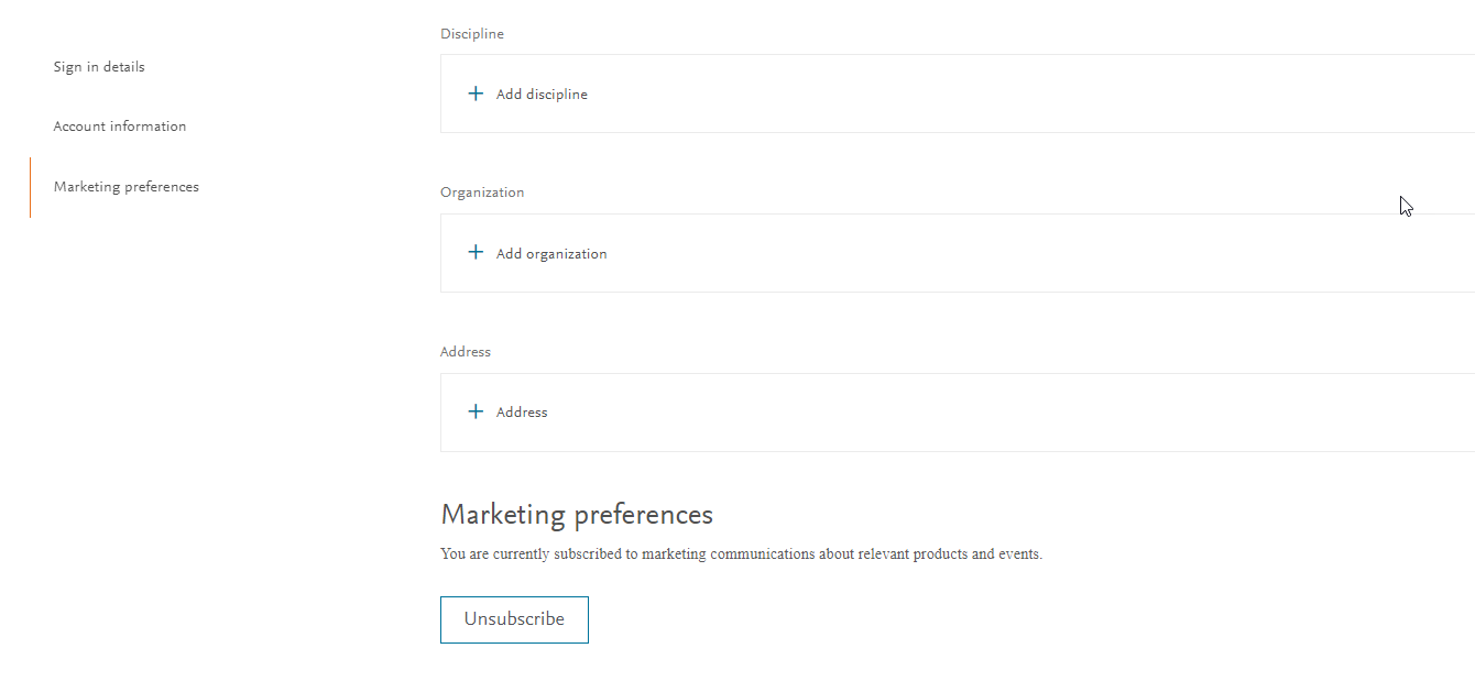 - Sign in to your Elsevier Account settings page and go to the Marketing preferences section.