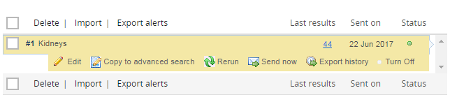 - Last results: The number of results your query had when the alert was last sent out. Clicking this number takes you to the Search Results page.