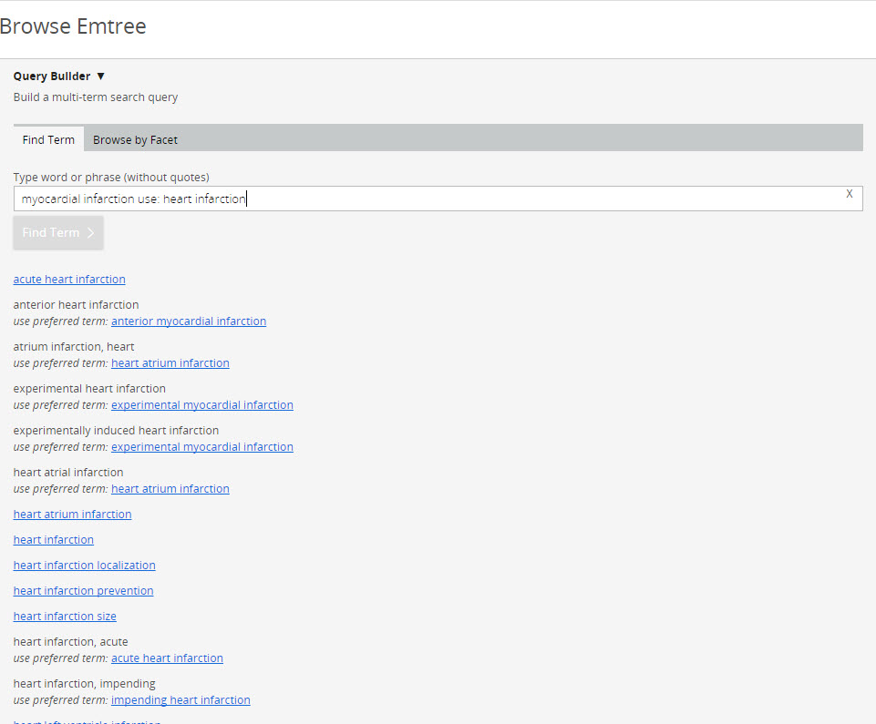 - Terms in normal black text are synonyms. Preferred Emtree terms are live blue links with a use: reference. For example, 'myocardial infarction use: heart infarction' shows that the preferred Emtree term is 'heart infarction'.