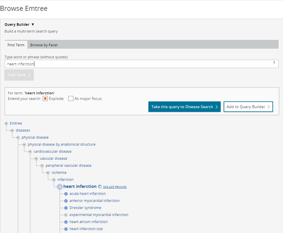 - Browse through all indexed terms using a tree structure which also allows searching for groups of terms (e.g., all monoclonal antibodies). Such searches are impossible using databases with no tree hierarchy. Without using Emtree, a search on 'heart attack' would miss records mentioning 'myocardial infarction'.