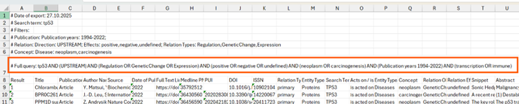 Export your entire search results, including the full query and applied filters, into a neatly formatted Excel file.