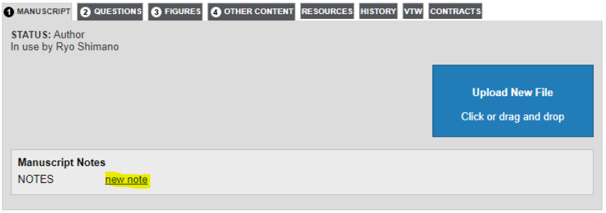 During the review process, the Reviewer/Editor may provide suggestions, pose questions, or seek clarifications. If you require further clarity regarding the Reviewer/Editor's instructions, you can directly contact them via the EMSS platform for more detailed guidance. Simply click on the "new note" option highlighted in the provided image and post your comment accordingly.