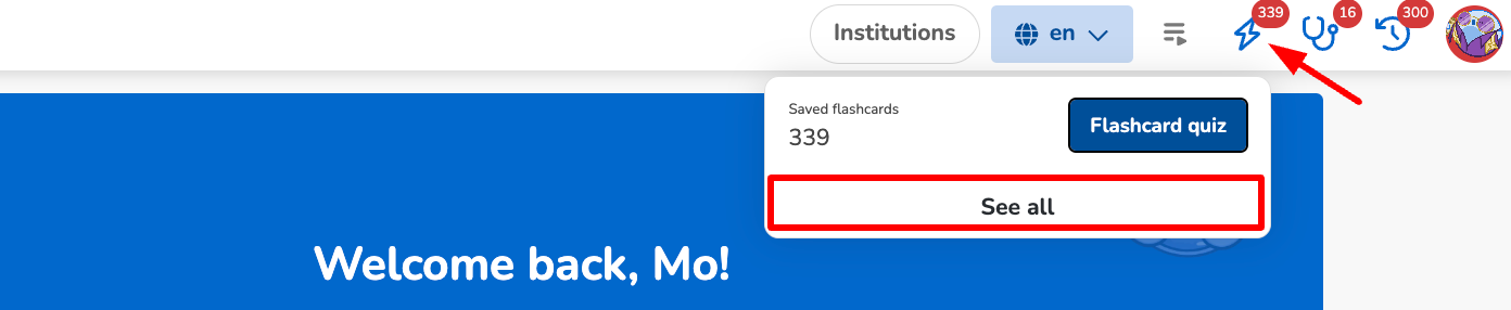 View Saved Items: Click on the Saved Flashcard Icon and select 'See All'. This will direct you to a page where you can see all your saved flashcards and saved questions.