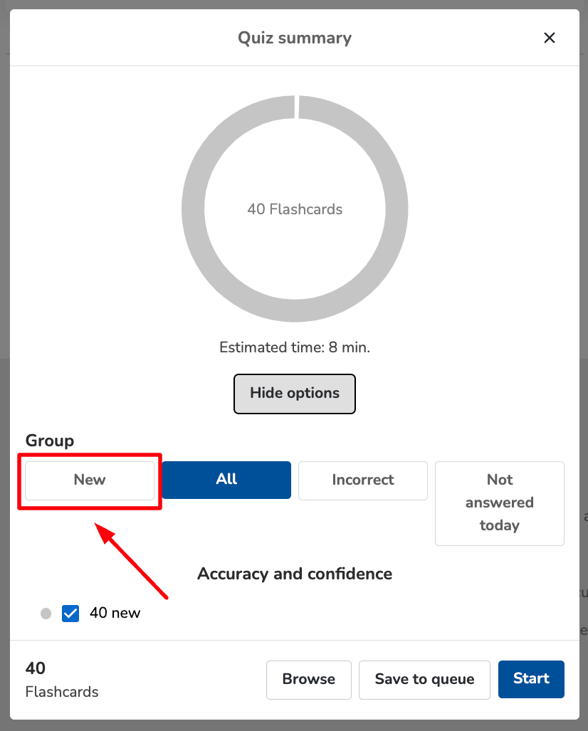 Select New Cards: Check the option for “new” cards to filter your quiz to only those flashcards you haven’t encountered before.