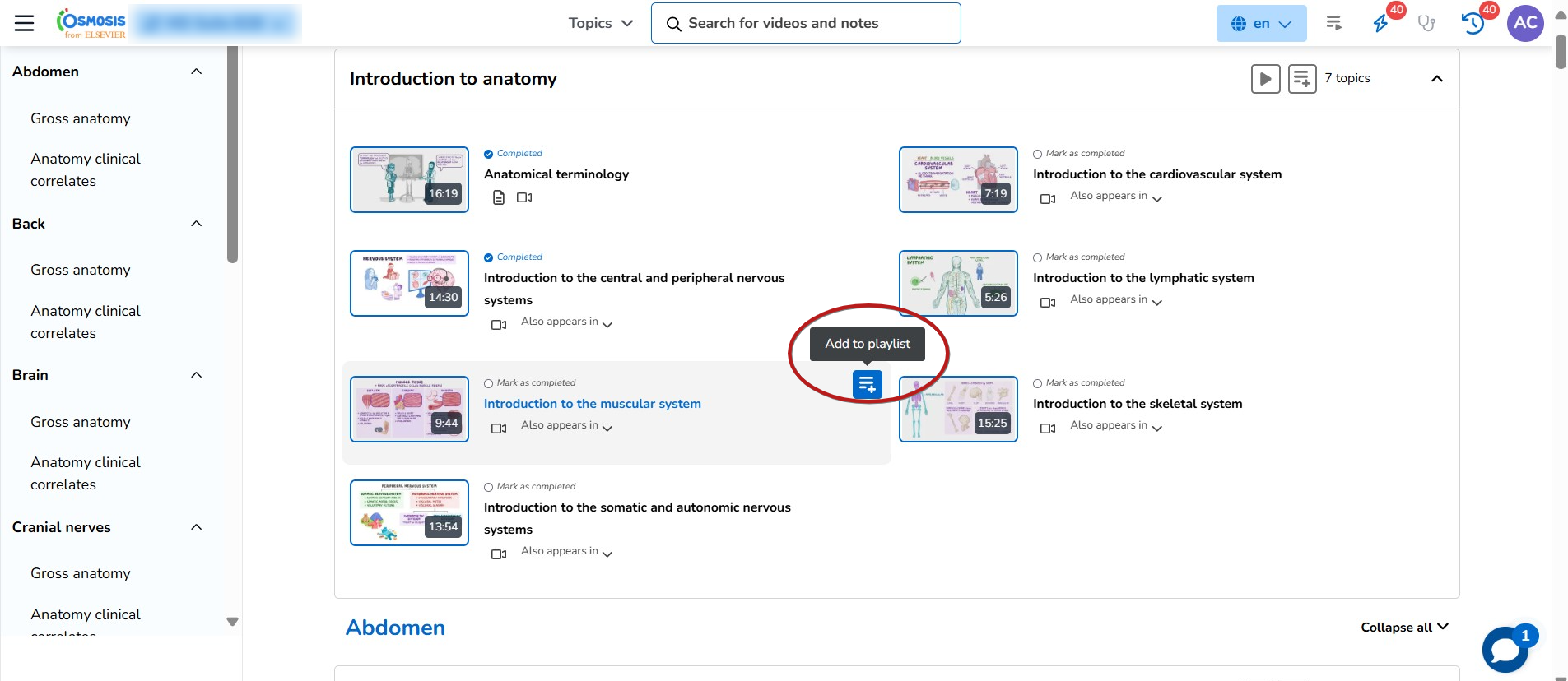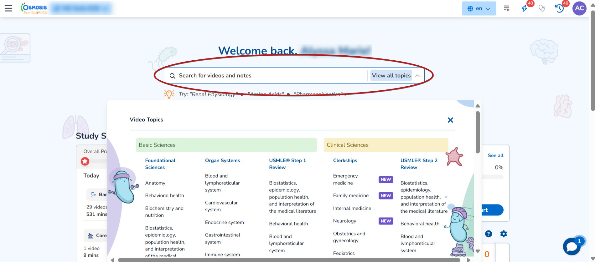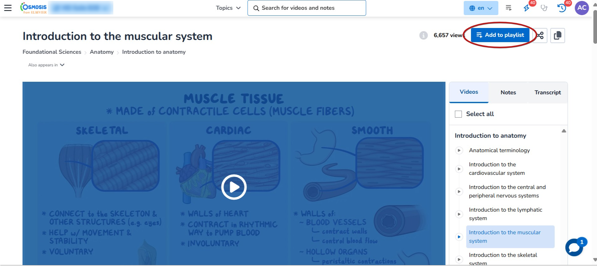 Creating a playlist of curated videos for your students is easy. Let’s look at how to build a playlist using the Osmosis Video Library and the search bar as a starting place.