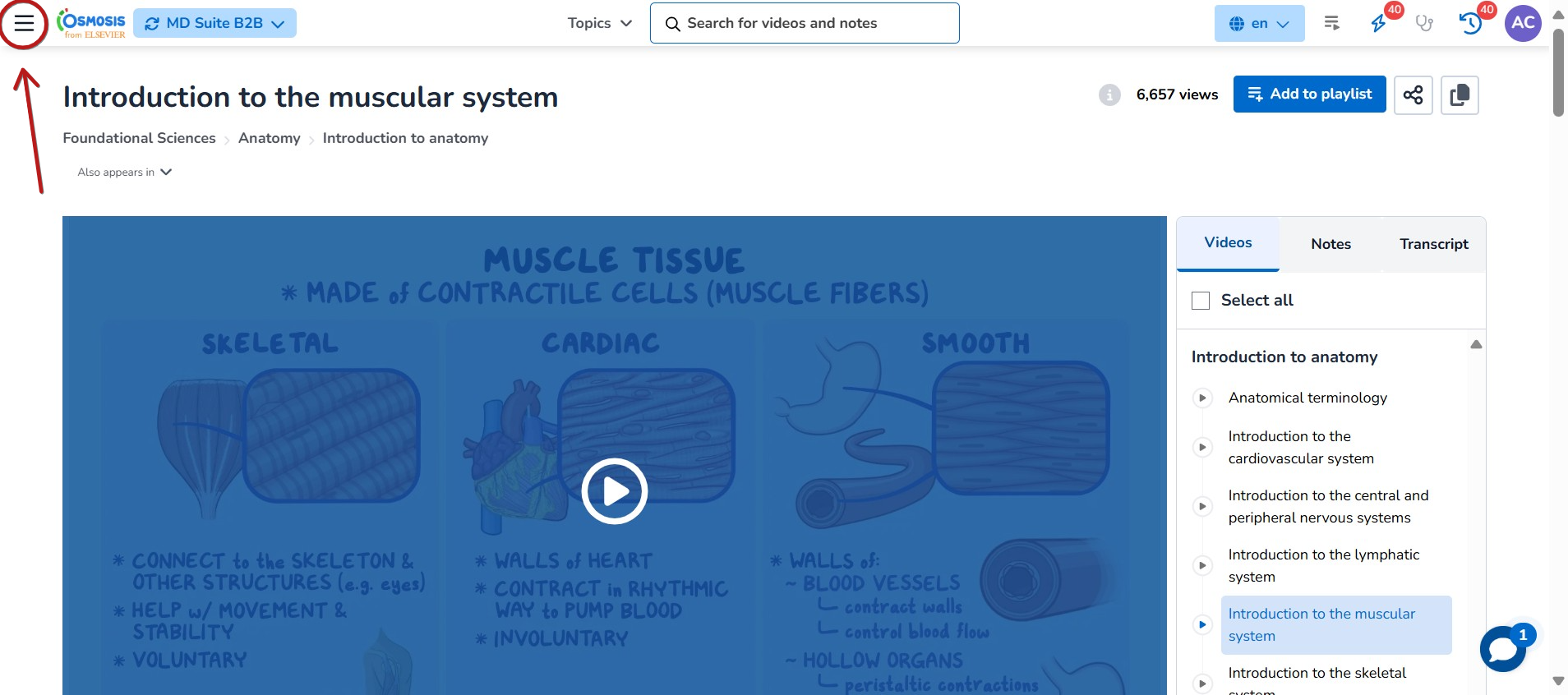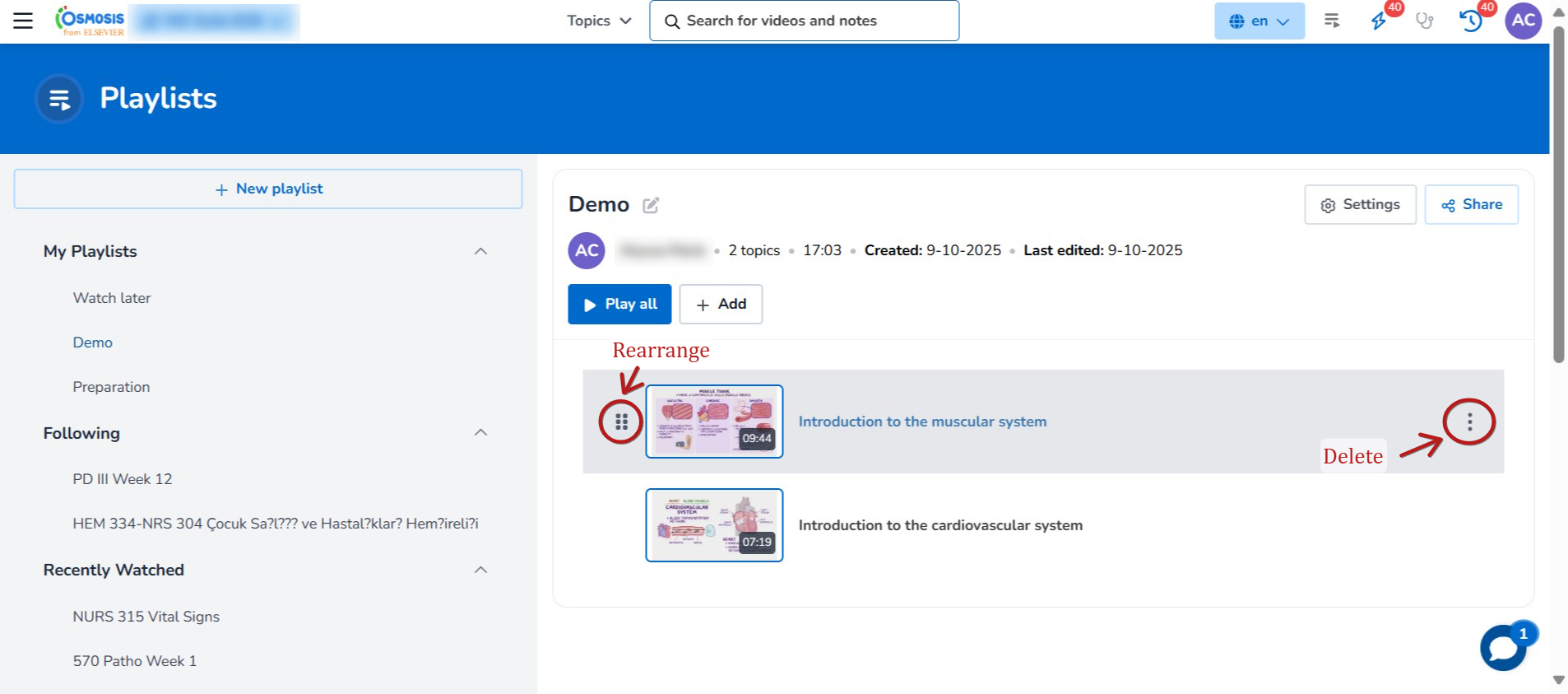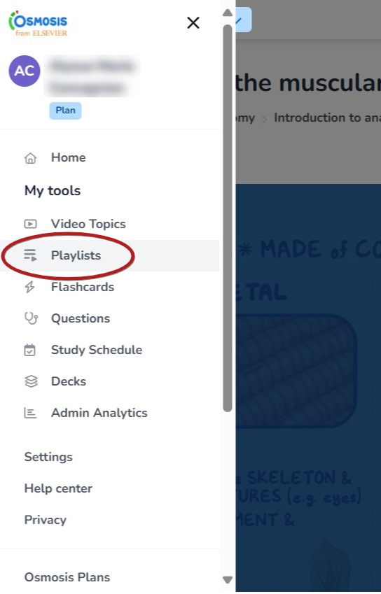 Step 4: To view, edit, rearrange, and share your playlist, (Step 4A) click the hamburger menu next to the Osmosis icon) and (Step 4B)select the playlist you’d like to see from the playlist page.