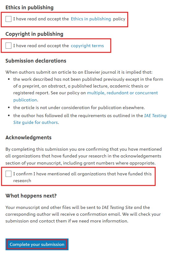 Then, read and agree to the ethics of publishing policy and copyright terms. Also, confirm that you have disclosed all funding to organizations for your research.