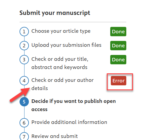 A list of submission stepsis displayed on the right side of the screen. This list shows which steps have been completed, which steps remain, and your current progress. If any required information is missing, the related step is marked with an error. You can choose a specific step to edit and add the necessary details.