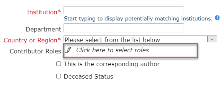 - Scroll down to the heading Contributor Roles and select "Click here to select roles" to reveal the CRediT list.