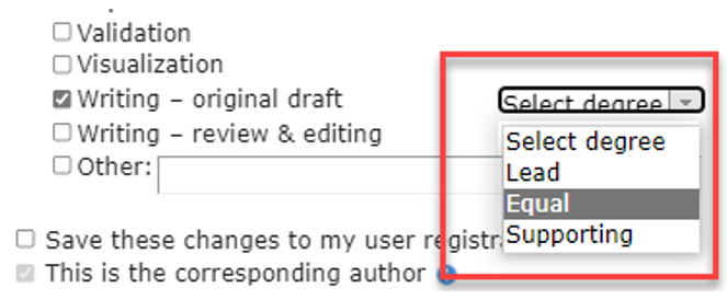 - The journal may require you to select the degree of contribution for each selected role, as in this screenshot .