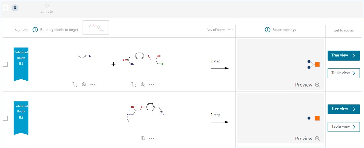 - Click the 'View' button to get to a 'Routes Overview' page, which displays a table containing starting materials and commercially available building blocks for each found route. This page allows easy comparison of the found routes based on the starting materials required. The displayed route topology thumbnails provide an overview on the complexity of the created synthesis plan.