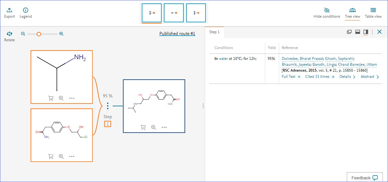 - Click 'Tree View' if you like to see all details of the generated synthesis plan in a graphical representation.