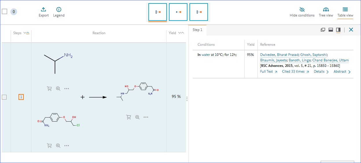 Reaxys supports synthesis planning in various ways. While a simple search for a substance (as single structure or as part of a reaction) retrieves reaction information (preparations or reactions), if available, it is also possible to create complete synthesis plans starting from a desired target molecule tracing the synthesis back to desired starting materials or commercially available building blocks. Reaxys Retrosynthesis allows you to create retrosynthesis projects for known and unknown substances using the Reaxys reaction database directly (Published Retrosynthesis) or, as an optional module, using artificial intelligence based on Reaxys reaction data (Predictive Retrosynthesis). For more information, review our Retrosynthesis Workflow, watch our video tutorial on using the Reaxys Retrosynthesis feature, or download our Fact Sheet(Opens in a new tab or window).