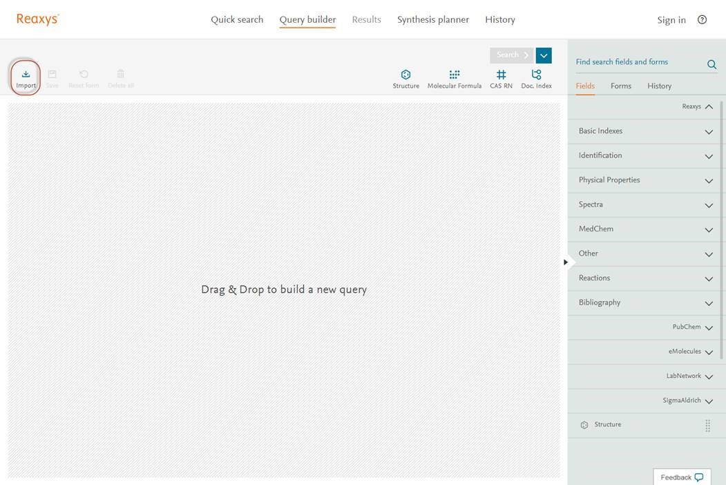 You can use batch querying for structure searches (exact and sub-structure) and field searches in all contexts of the database. Reaxys searches batch queries sequentially and at the end presents the result combined into one single hitset. A report is available on the result page showing the results for each individual query in the batch. The report is available in the corresponding breadcrumb (view a screenshot in step 3).