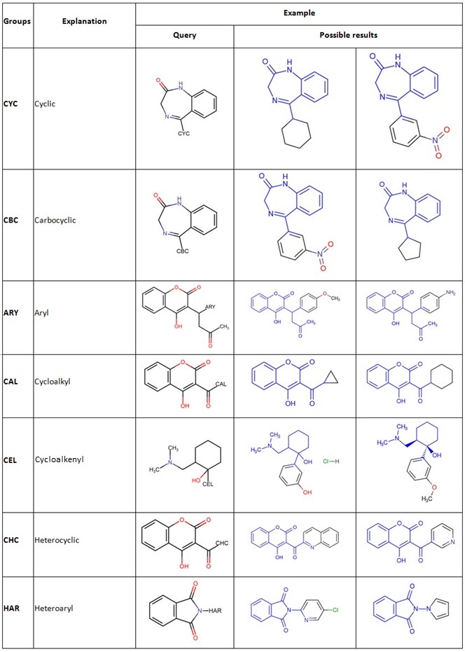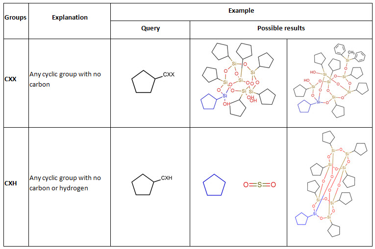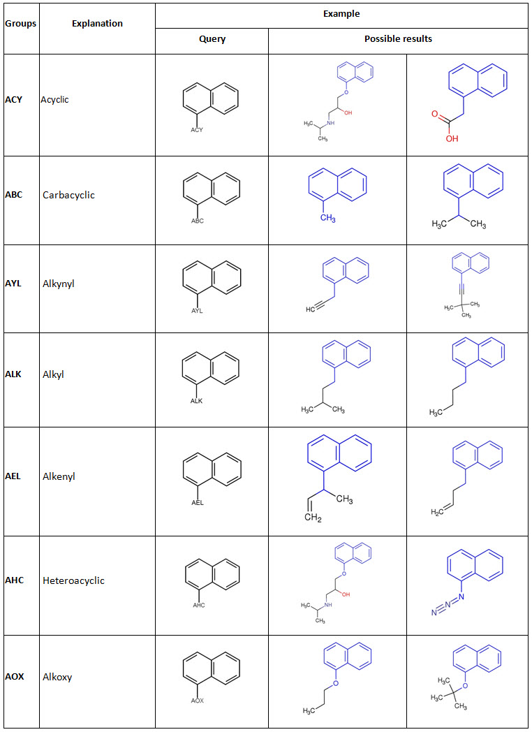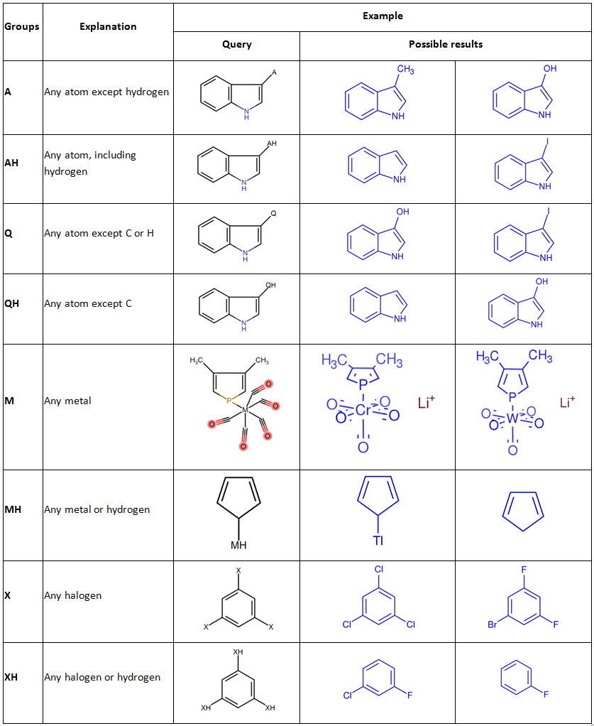These predefined generic groups are recognized by Reaxys regardless of the structure editor that created the query.