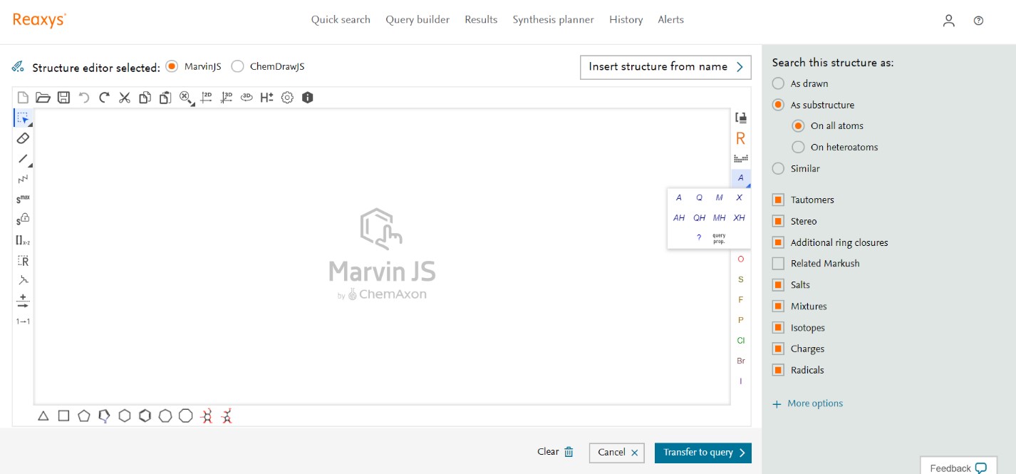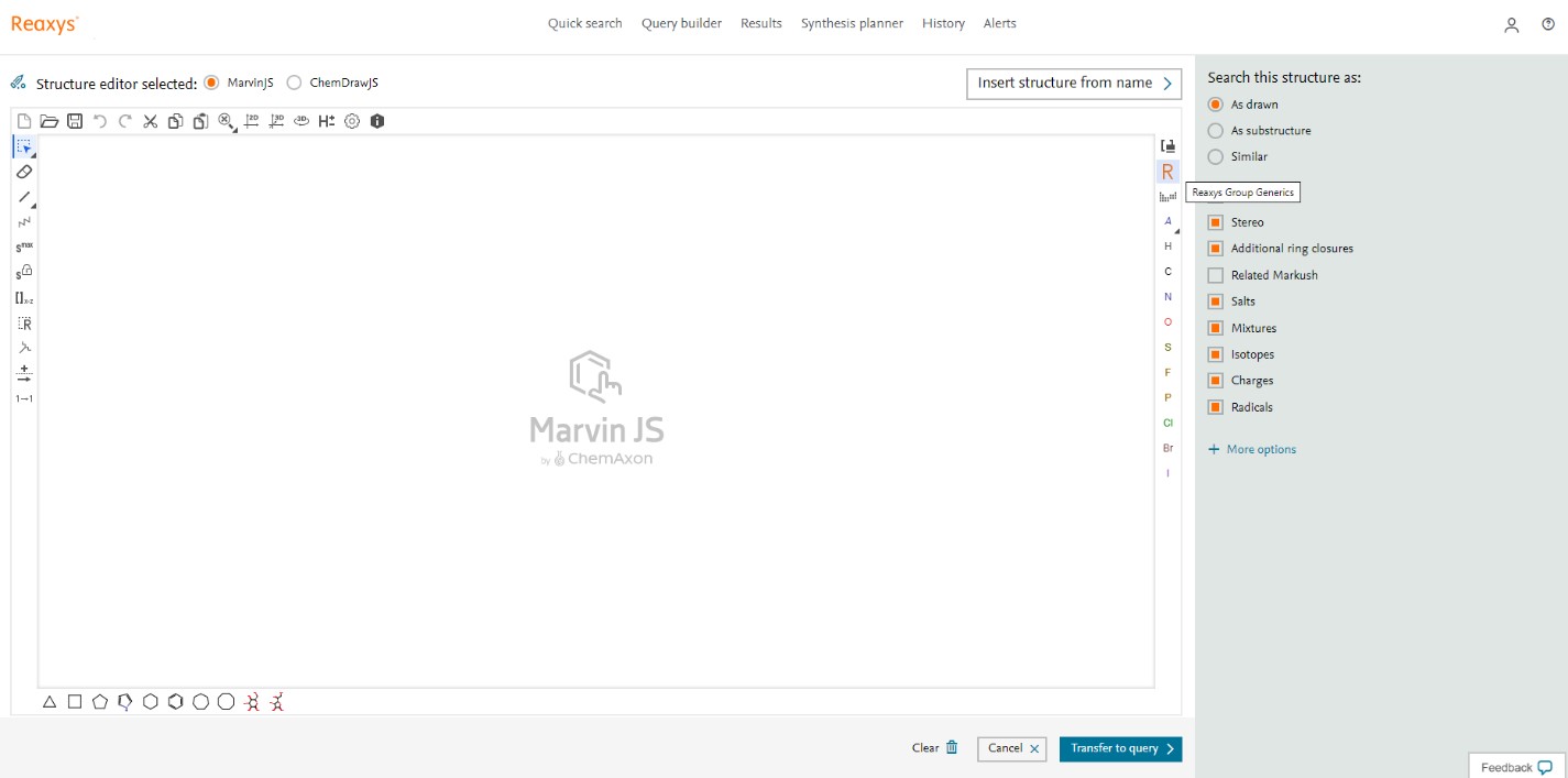 - Click ‘Create Structure or Reaction Drawing’ on the Reaxys home page to open the Marvin JS Structure editor.