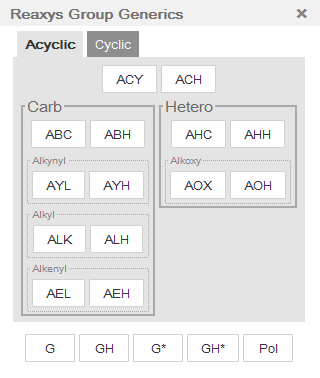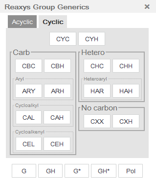 The Reaxys Group Generics tool is used to define acyclic groups and cyclic groups, while the Query Atoms tool is used to define atom generics.