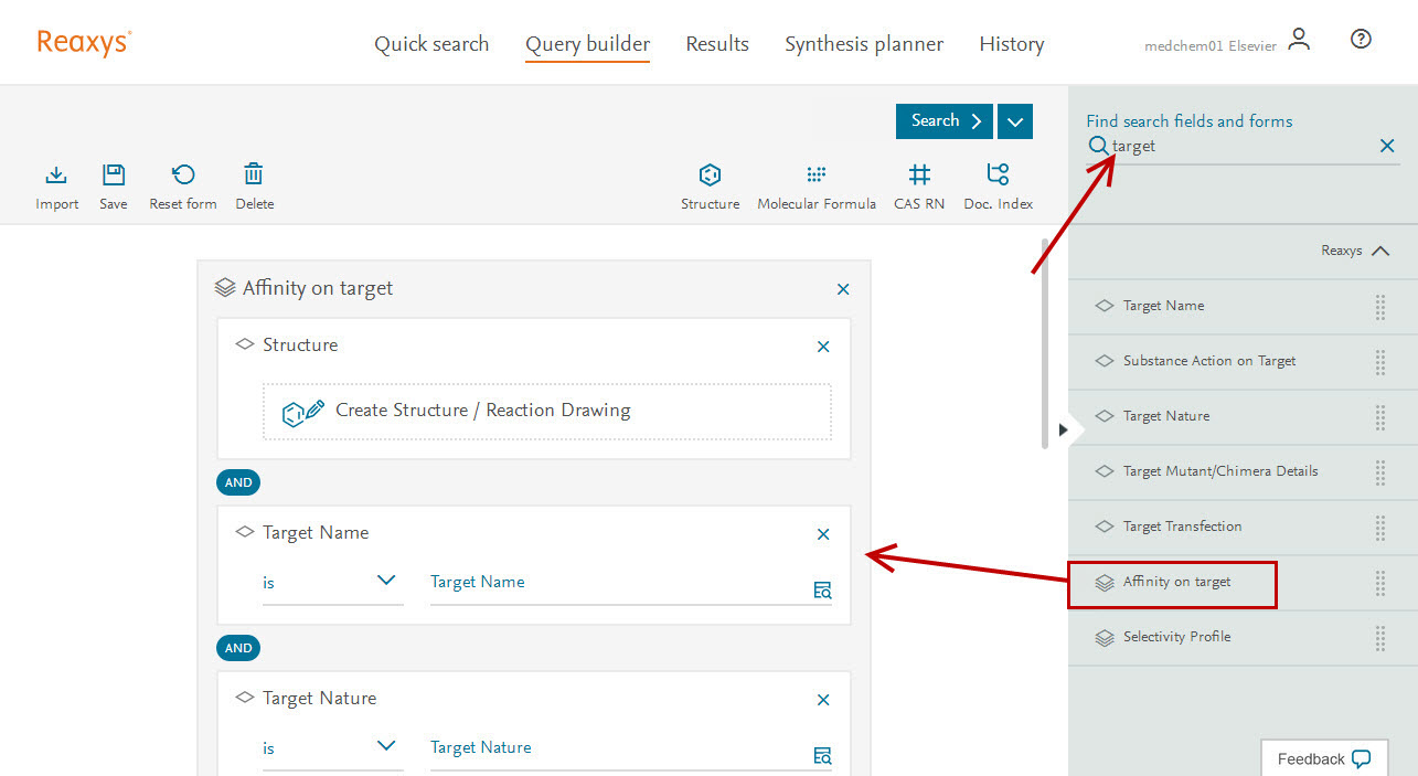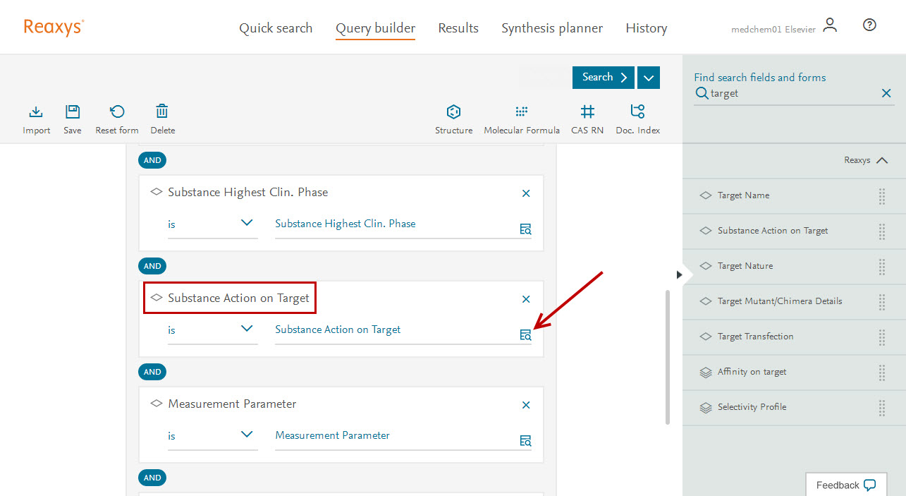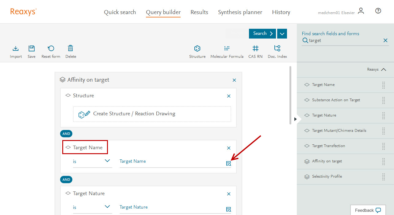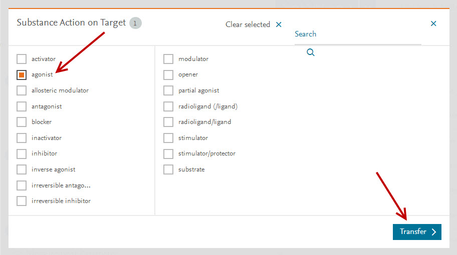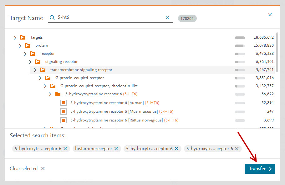 - Please Note: The search in the taxonomy is performed using a substring within the full name and the associated synonyms of the target. The searched term is highlighted in orange when found in synonyms and corresponding main terms are displayed as a flat list at the bottom of the page. In the Selected search items section the term(s) can be deleted by clicking the blue ’X’. Numbers on the right hand side of the windows are counting bioactivities (data points) on the corresponding target or family of target.