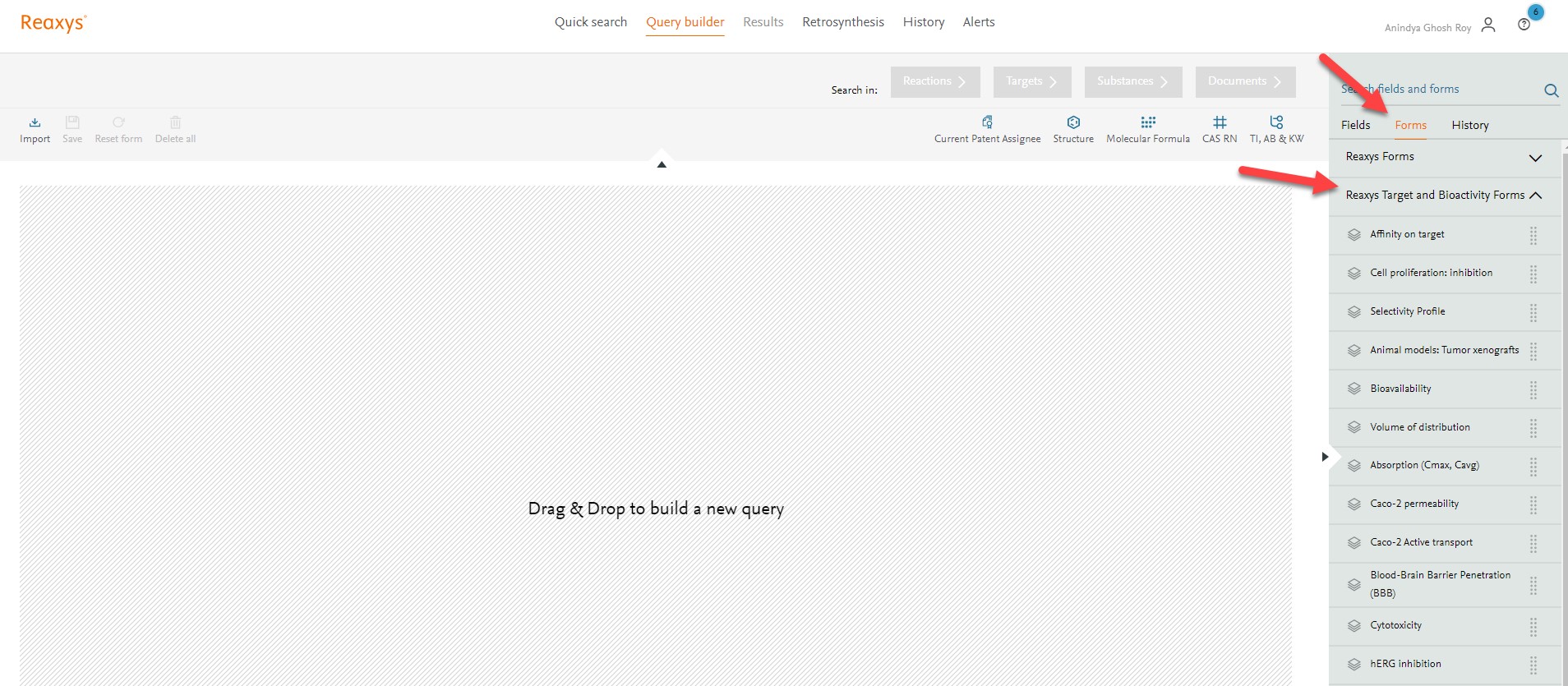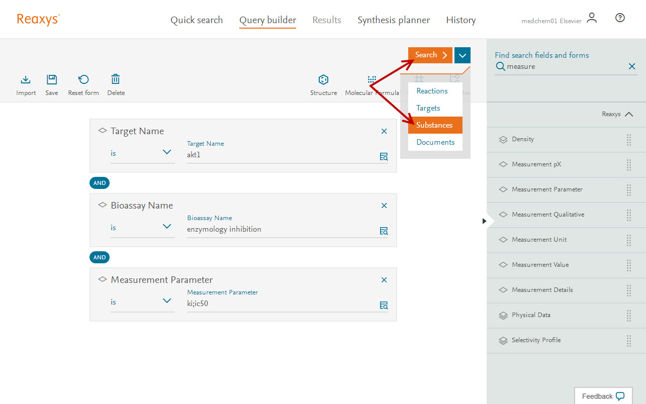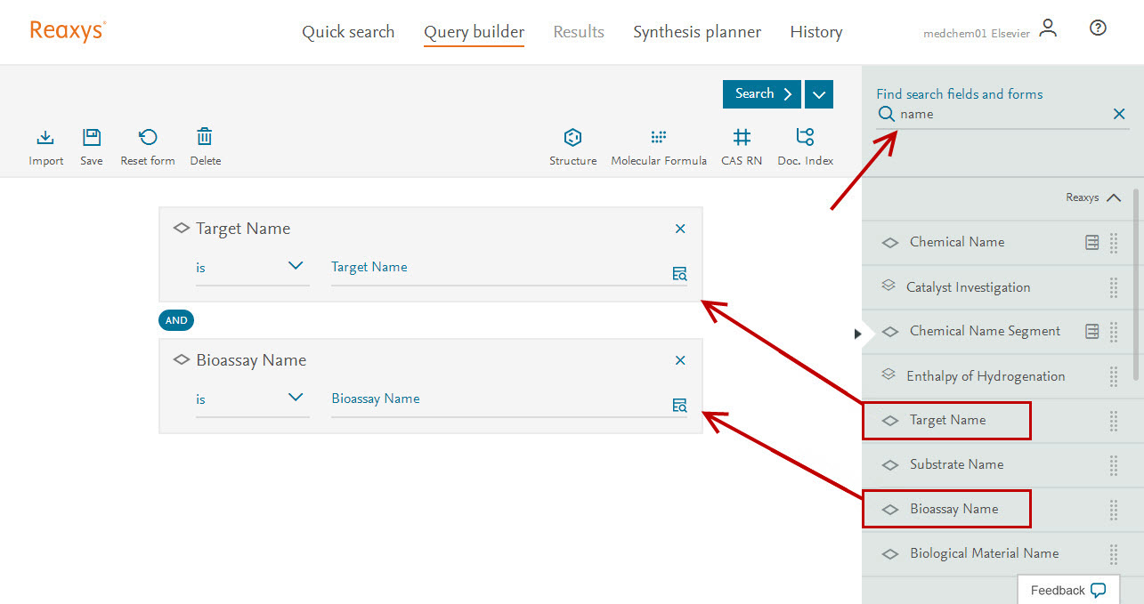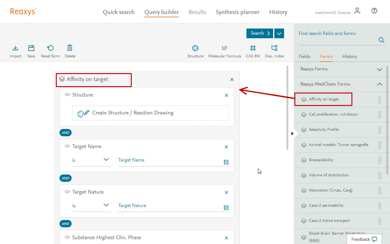 - Build a query using predefined forms dedicated to medicinal chemistry within Reaxys.
