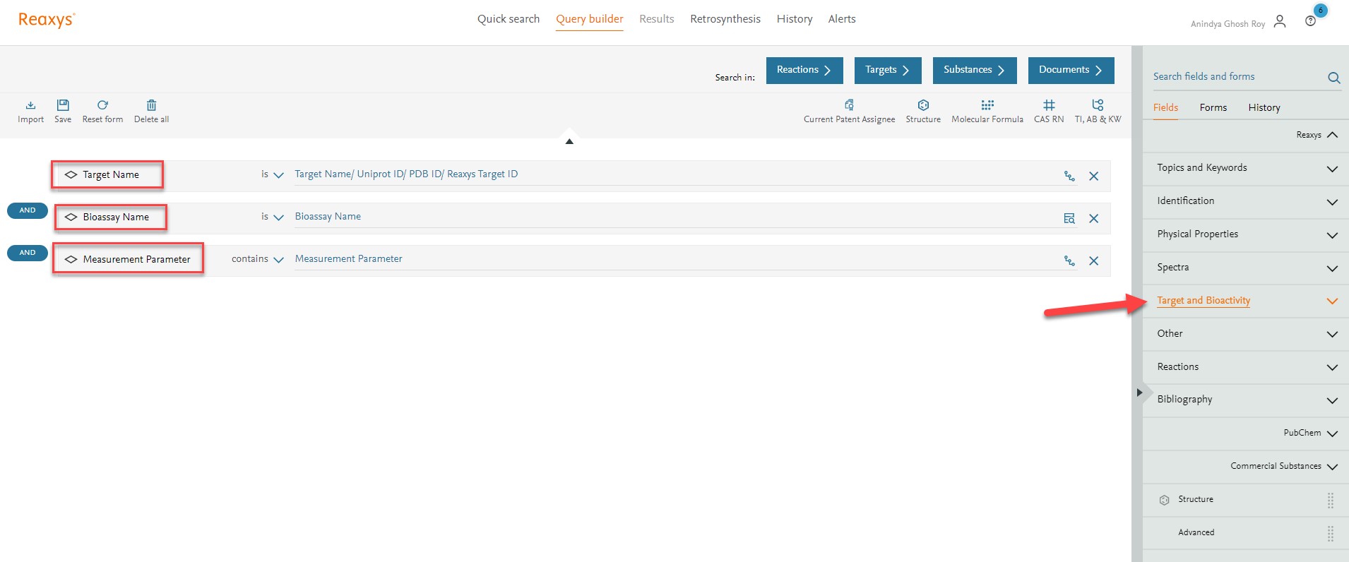 - Build a query from the Target and Bioactivity field section (drag and drop).