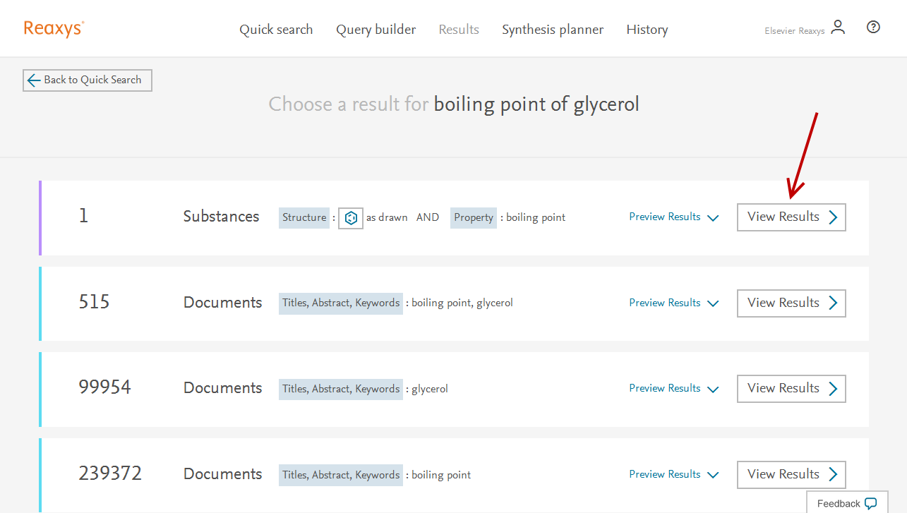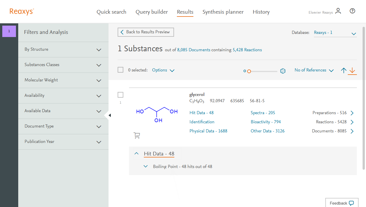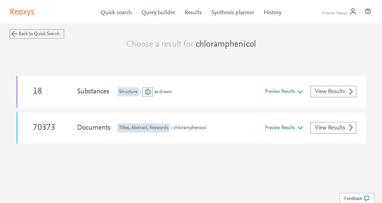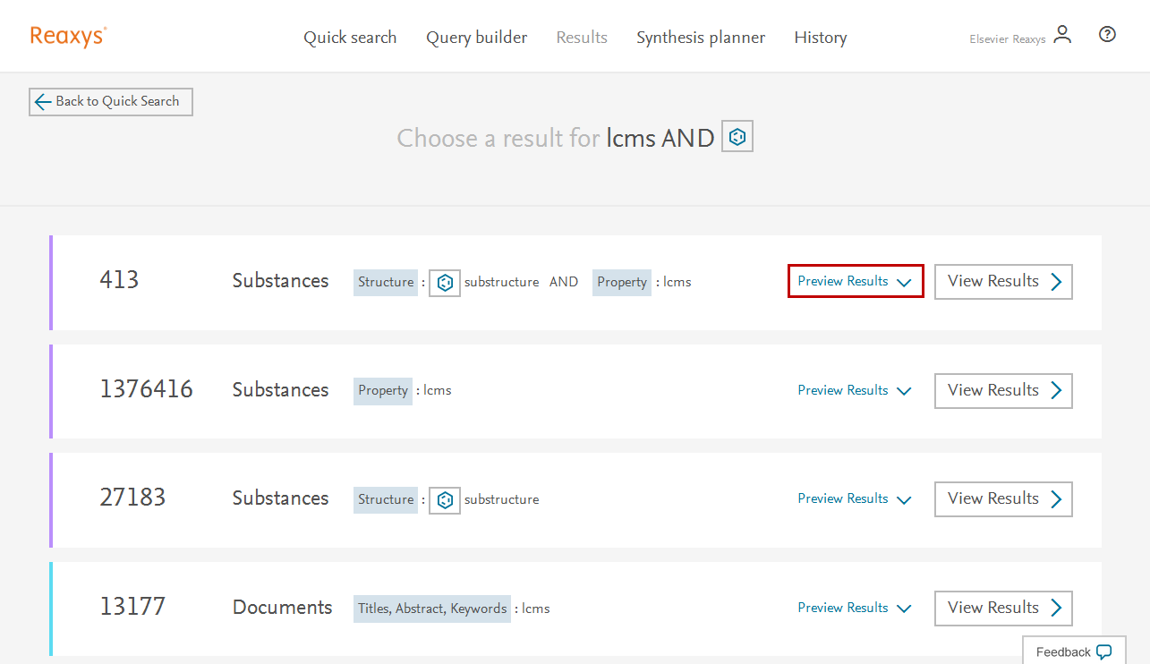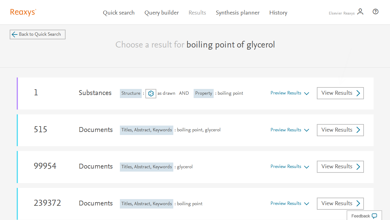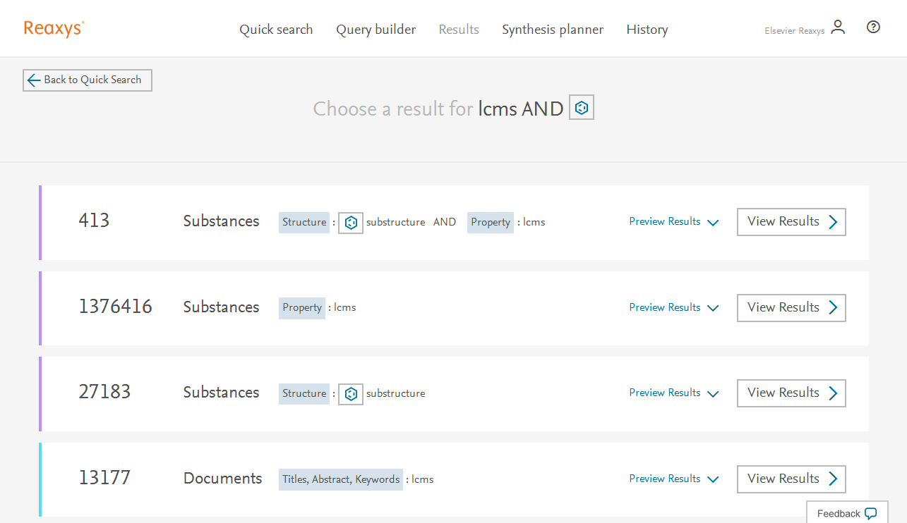 - In this case Reaxys presents a Results Preview showing four different variations of the entered query to provide you with options, which you may not have thought of at query formulation time: