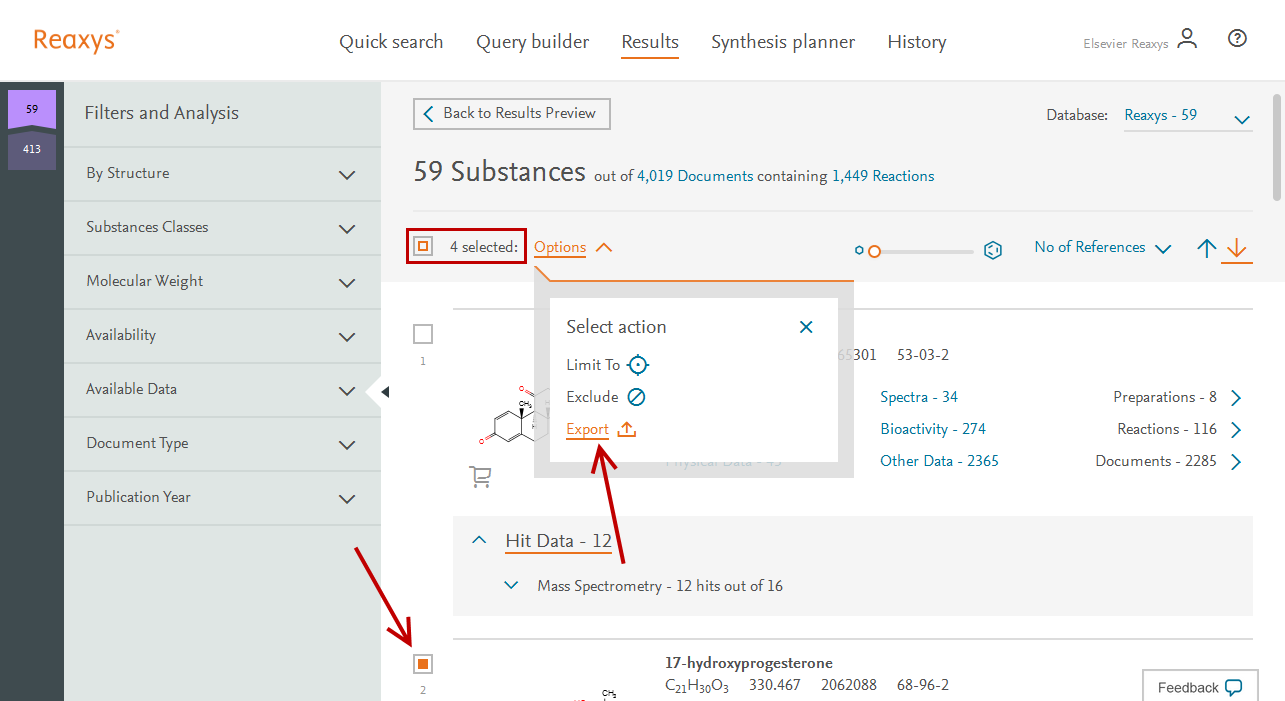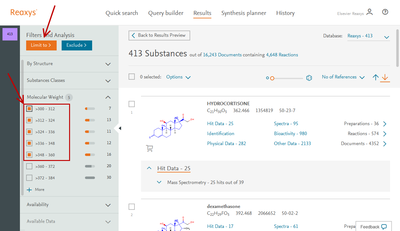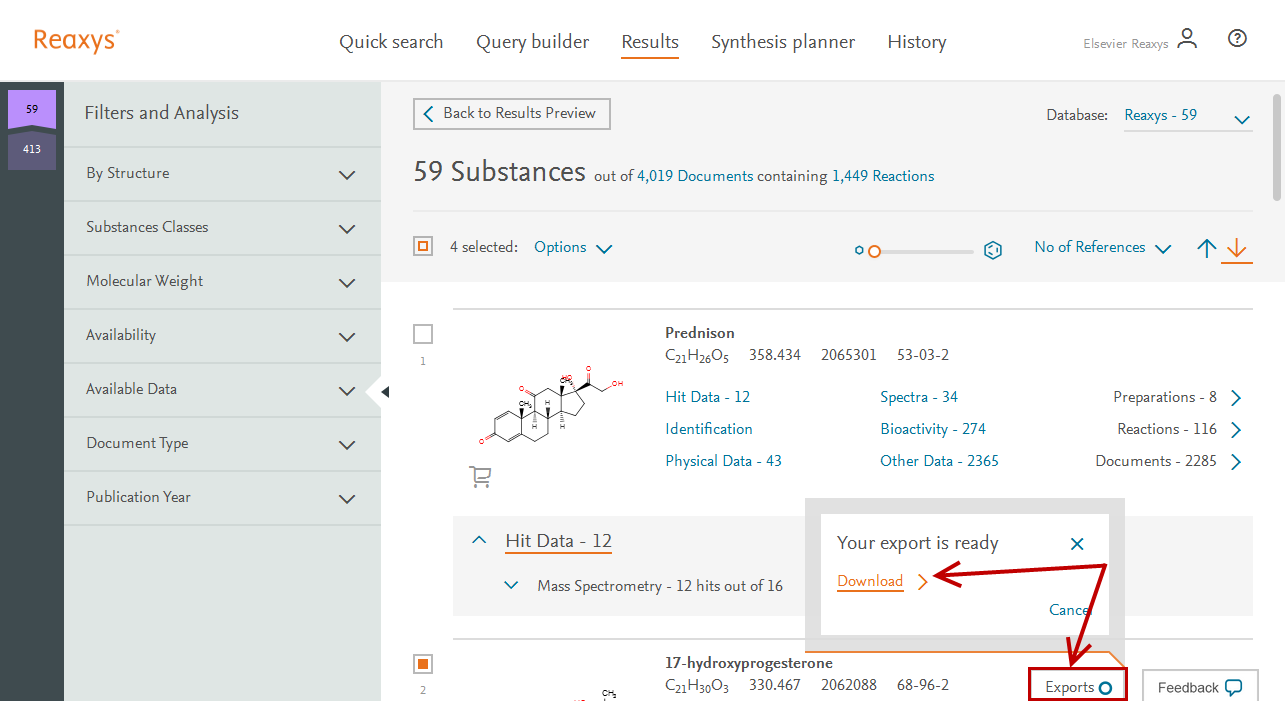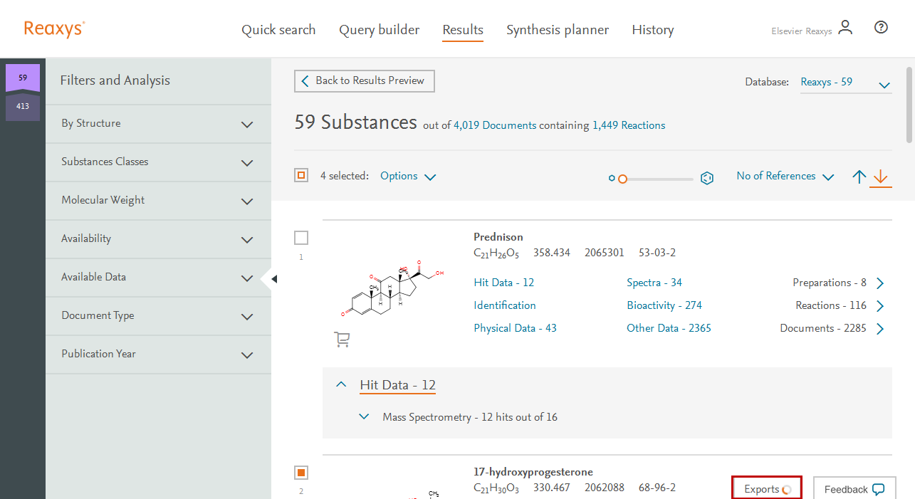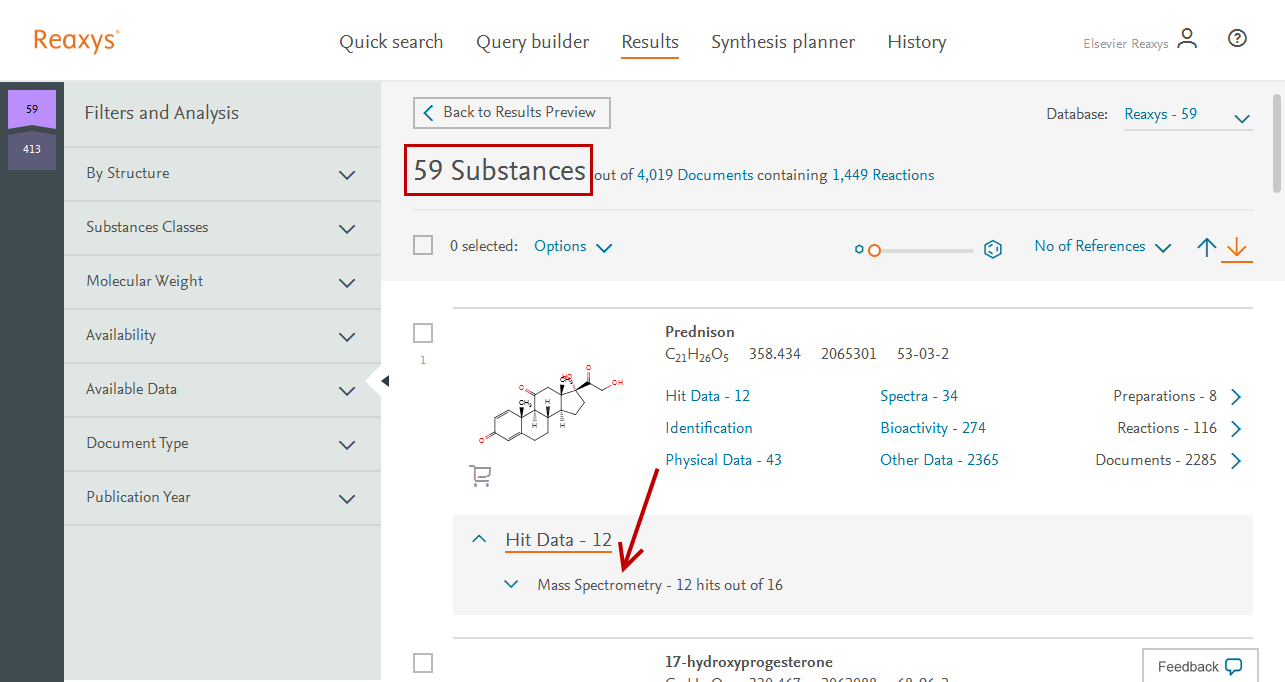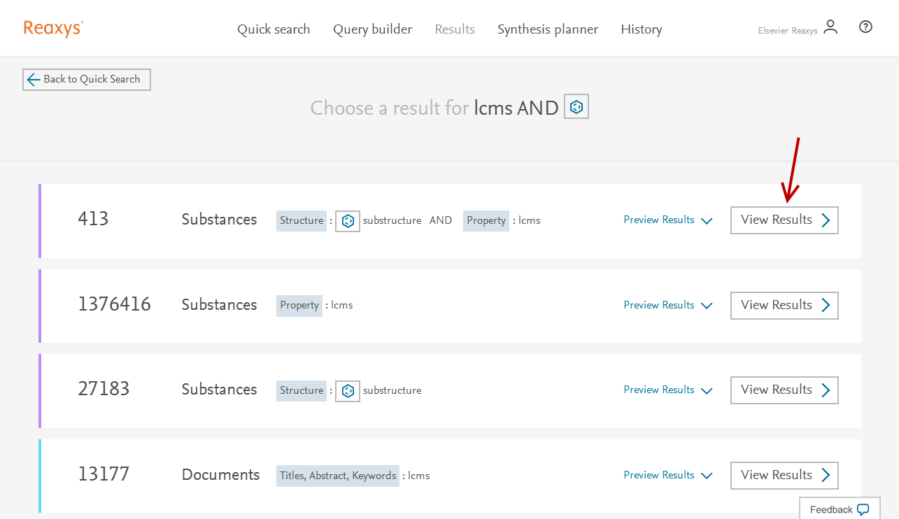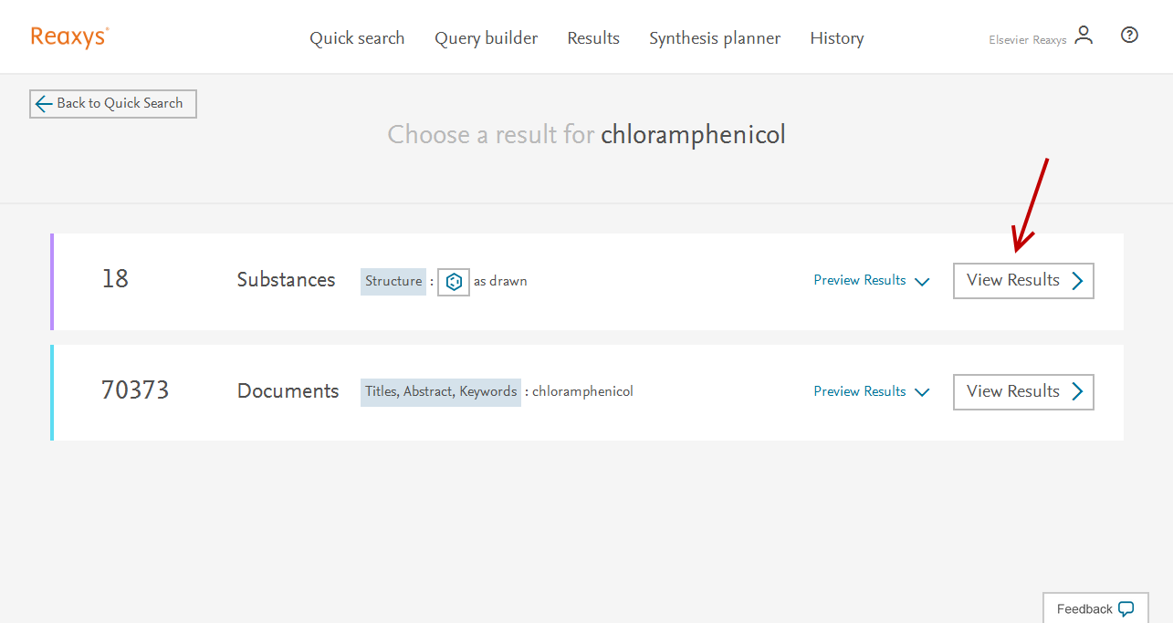 - In this case Reaxys presents a Results Preview showing four different variations of the entered query to provide you with options, which you may not have thought of at query formulation time: