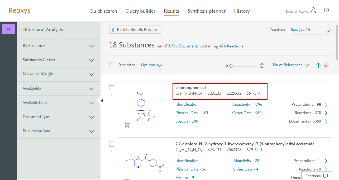 - For the first result, you can see the substance name, the Molecular Formula, the Molecular Weight, the Reaxys ID and the CAS Number.