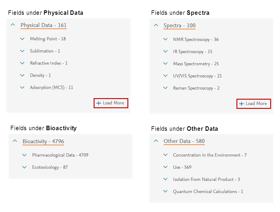 - You can click the links: Spectra, Physical Data, Bioactivity and Other Data in turn to find the fields of property information available – with an indication of the number of entries for specific data.