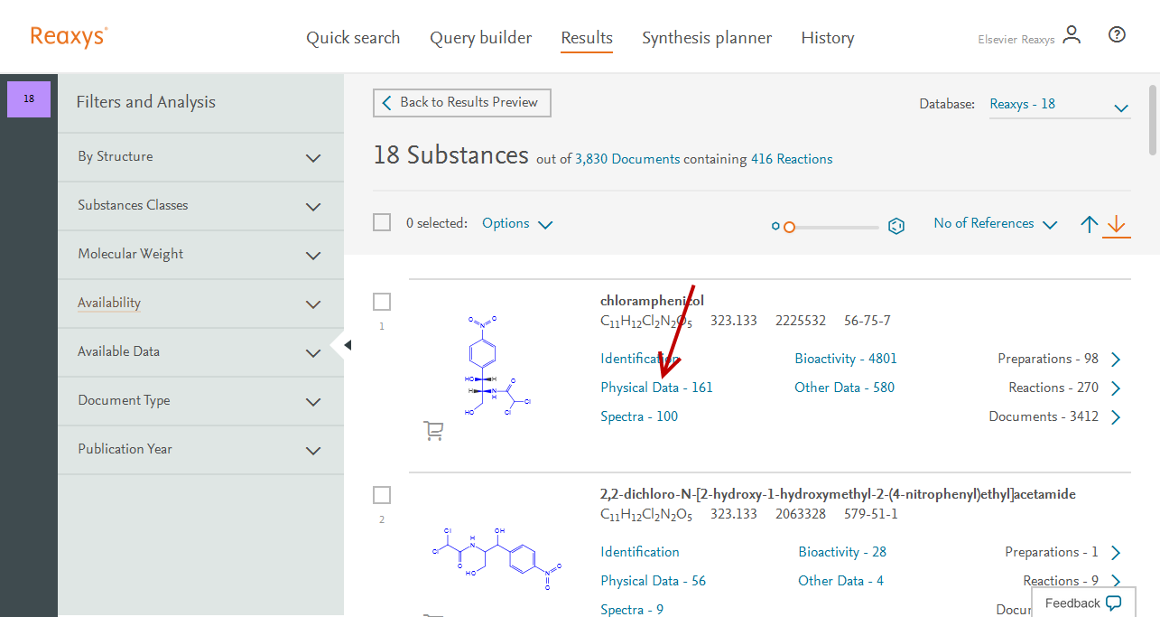 Note: Reaxys also searched the text term in Document Records, where you will also find a lot of property information for chloramphenicol.