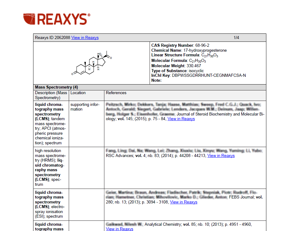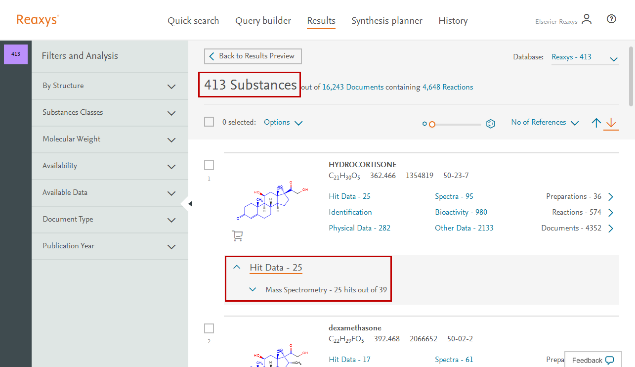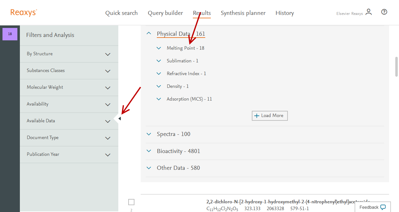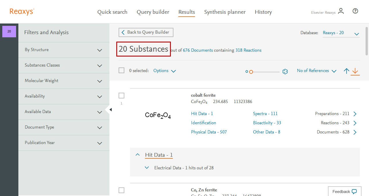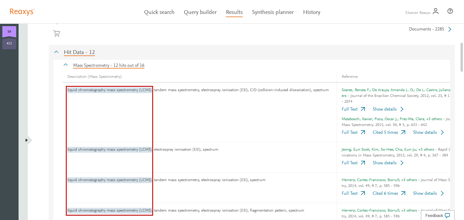 - The 2nd and 3rd results sets show the number of substances retrieved for the property: lcms (over one million in Reaxys!) and the substructure respectively.