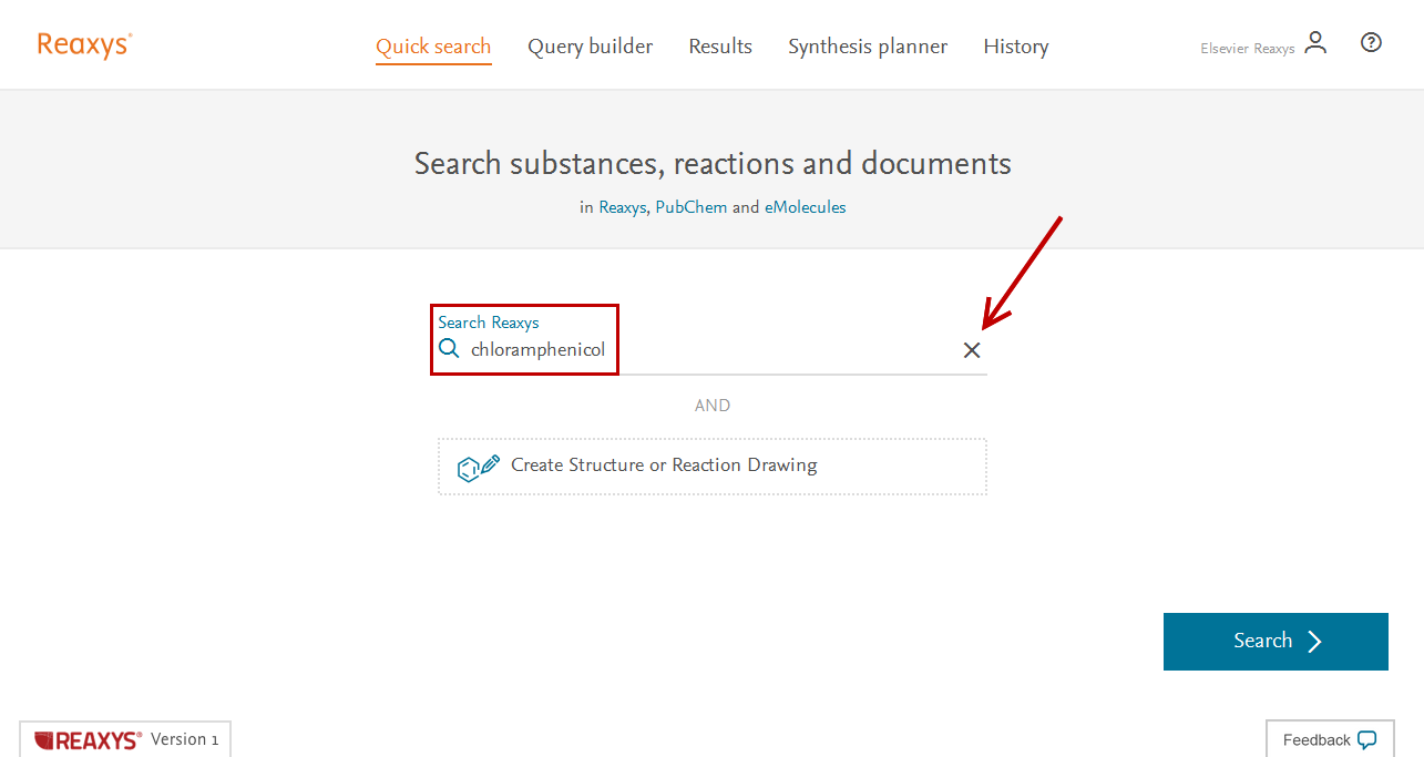 - On the Reaxys home page click the Search Reaxys field and type chloramphenicol