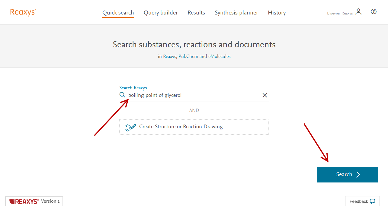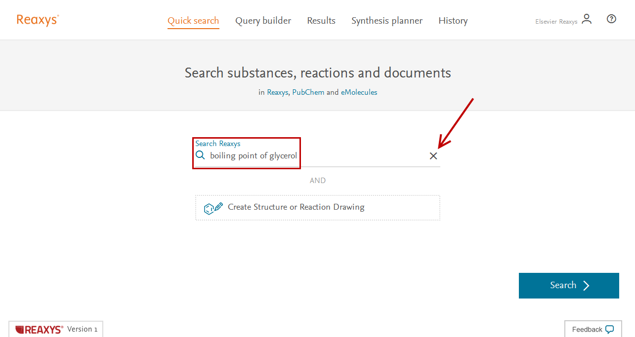 Clear the Search Reaxys field by clicking the 'X' - Click the Search Reaxys field and type boiling point of glycerol