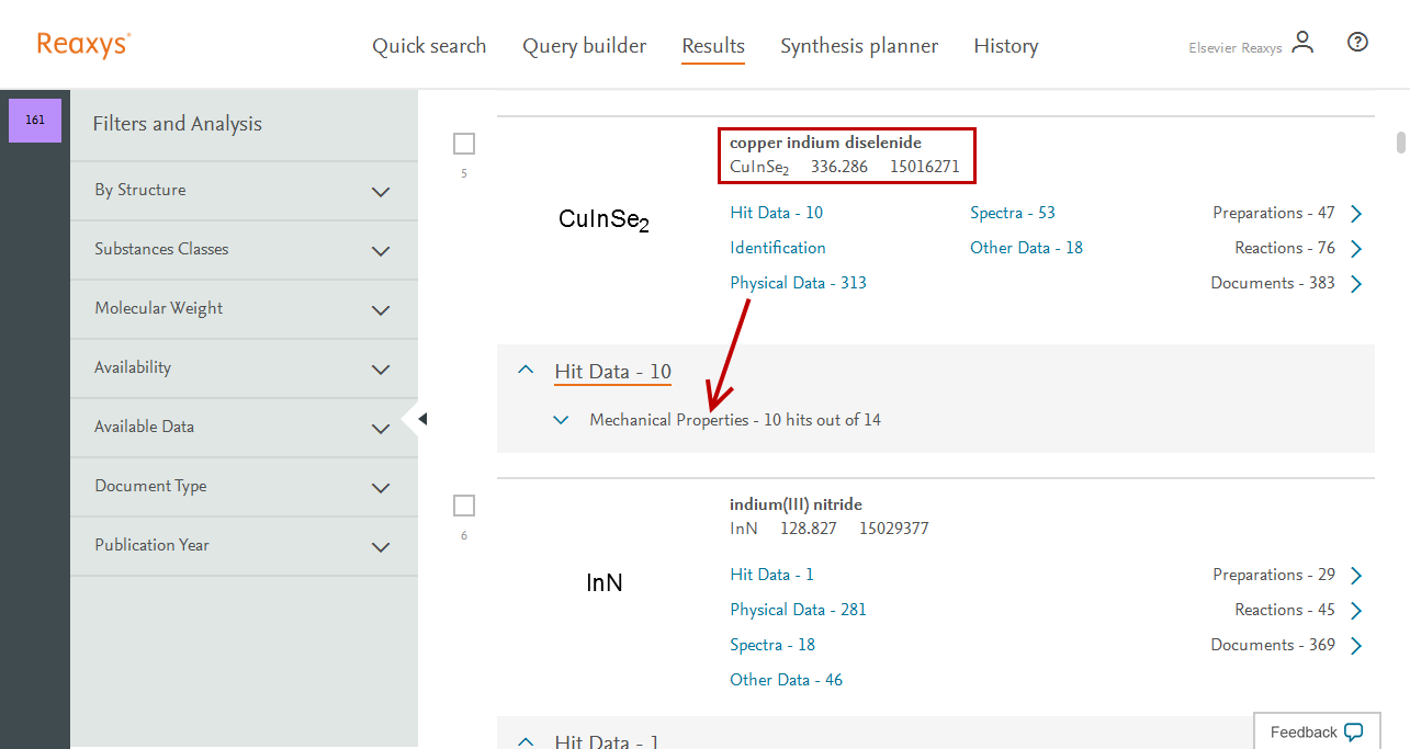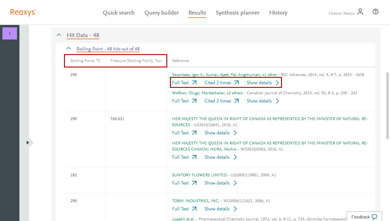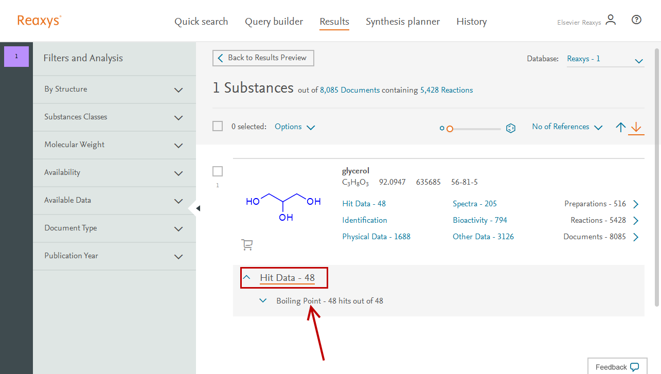 Note: Reaxys gives a link to Hit Data, i.e. to the specific field where the information searched is present.