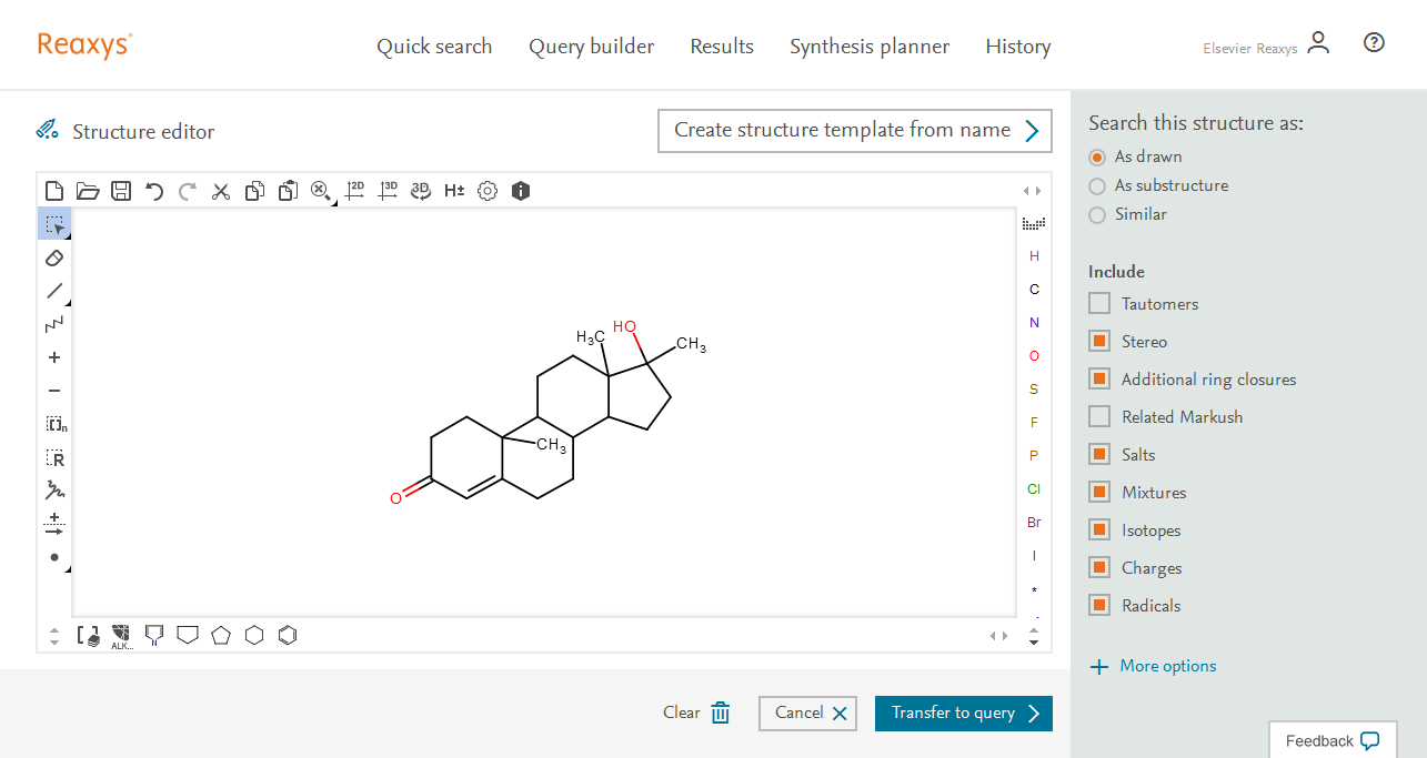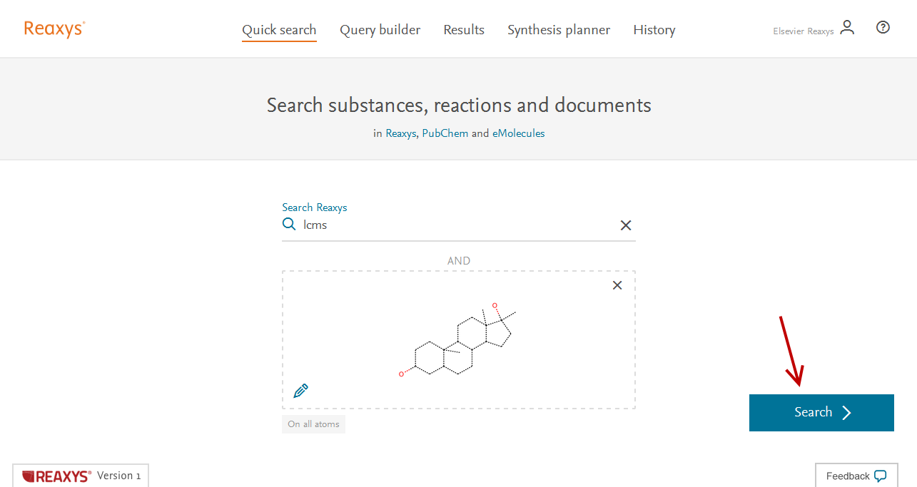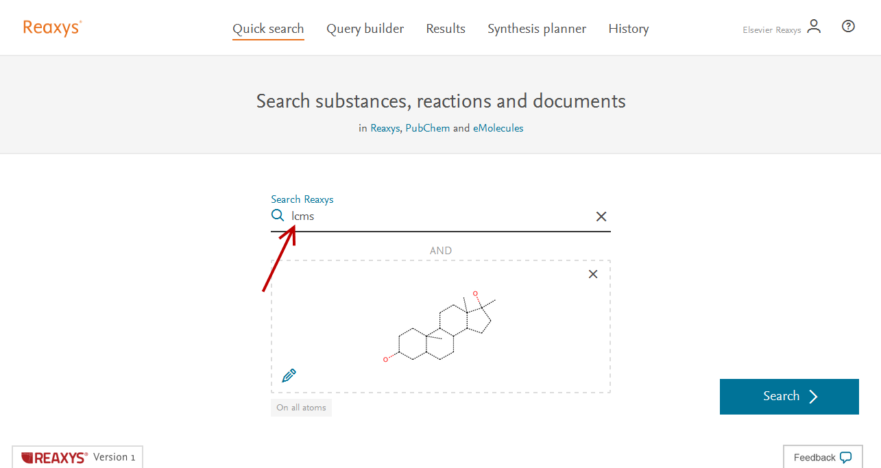 Click Transfer to query - On the Reaxys home page, click the Search Reaxys field and type lcms