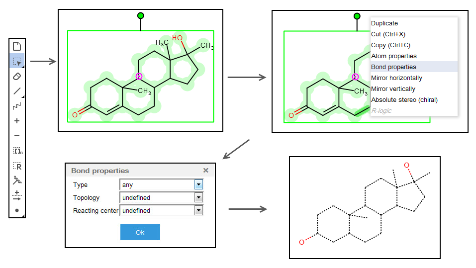 The structure for methyltestosterone in the Marvin JS drawing panel - Add Bond Properties: