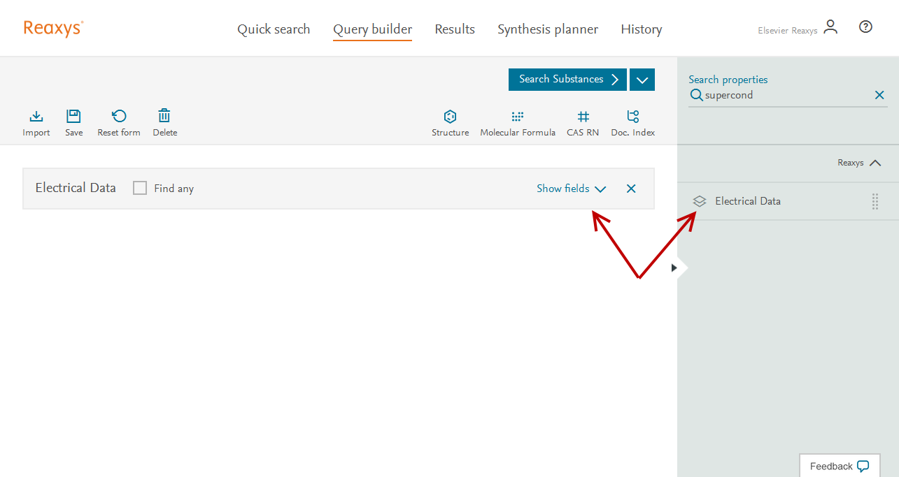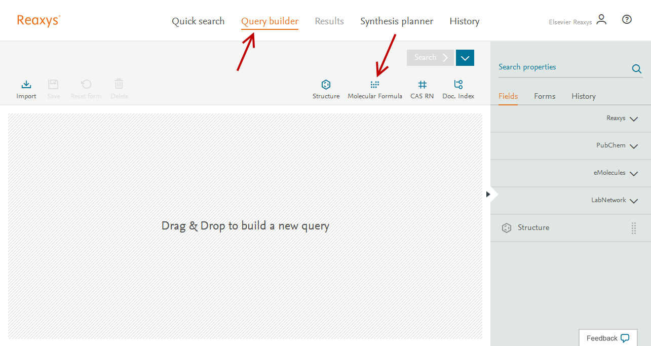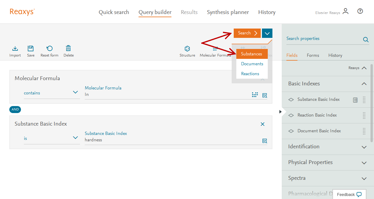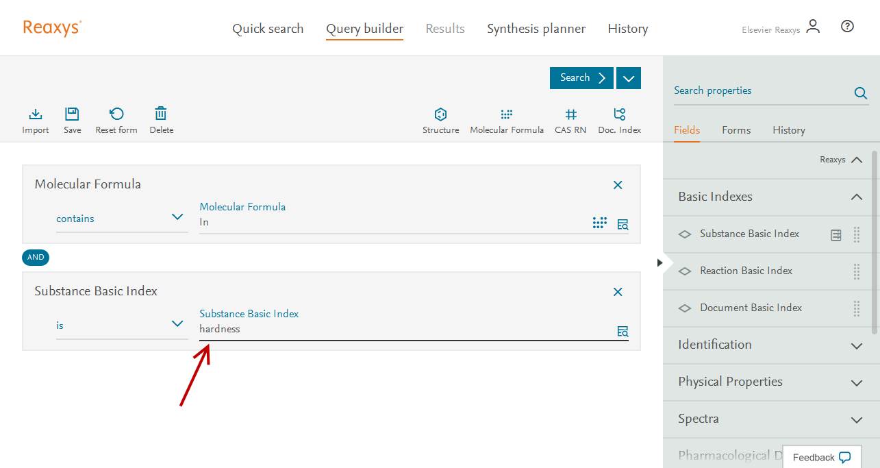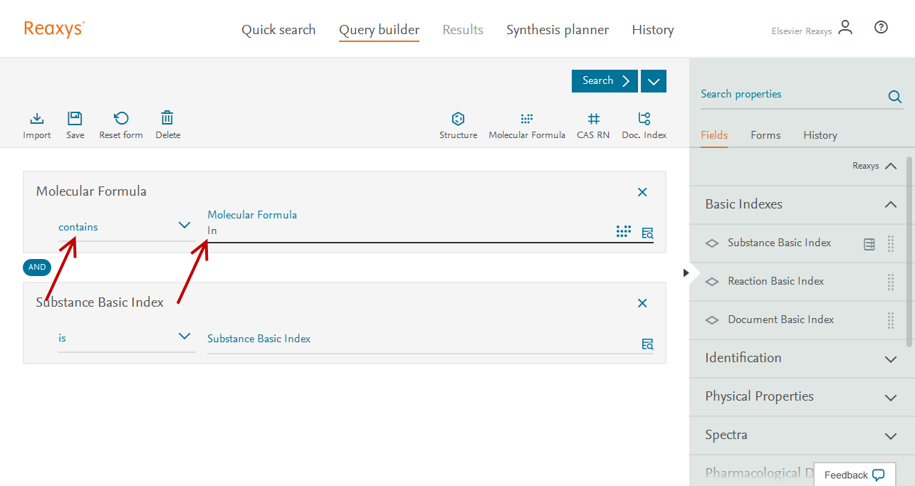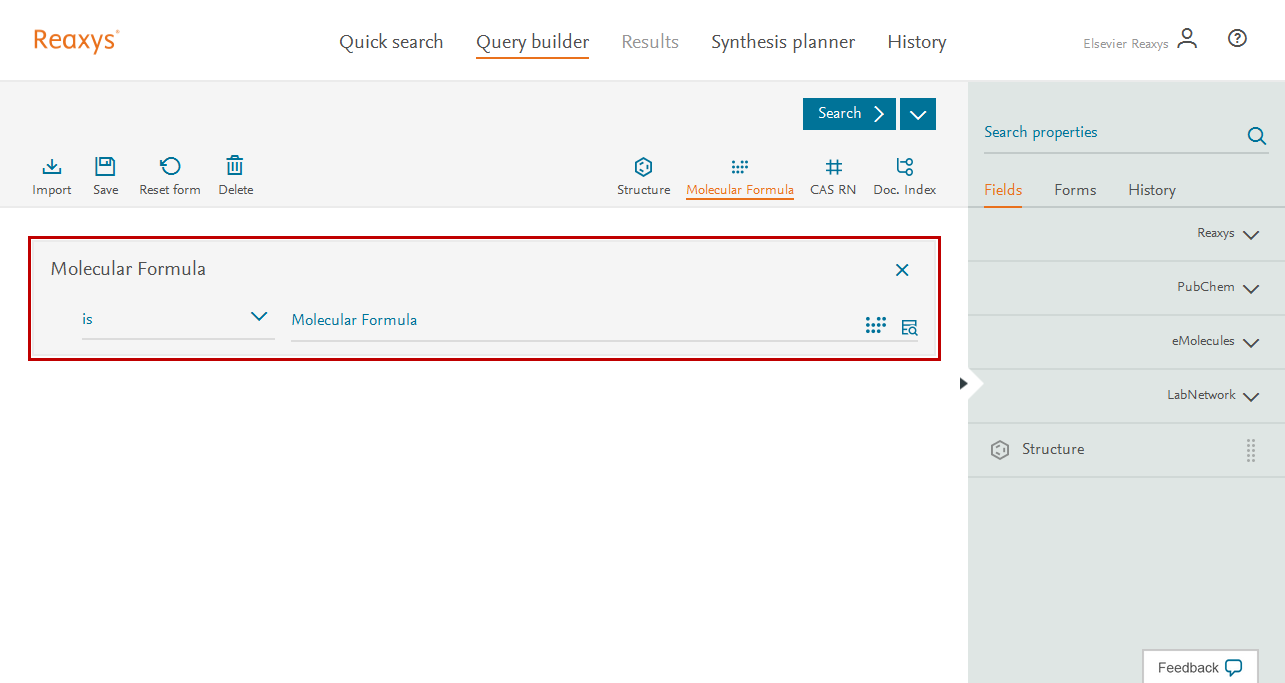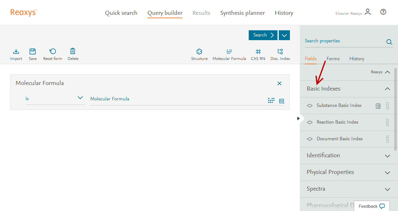 The Molecular Formula search field - In the Fields, Forms and History panel, expand Reaxys and Basic Indexes.