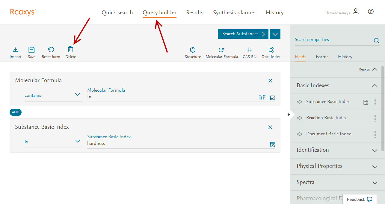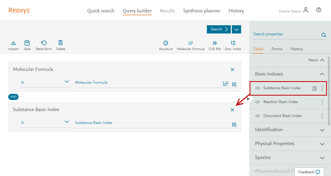 Expand Reaxys and Basic Indexes - Drag and Drop Substance Basic Index onto the Query builder