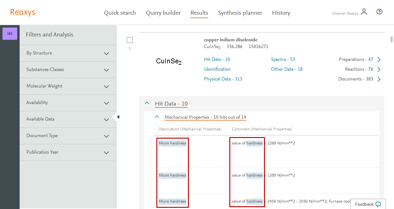 In some cases it may not be possible to effectively answer the question through Quick search. For example, consider a request to find information on the hardness of indium-containing substances. While a Quick search for hardness of indium substances will retrieve various Document Records, such a search would almost certainly not retrieve all the different ways indium-containing substances would be described in these records.