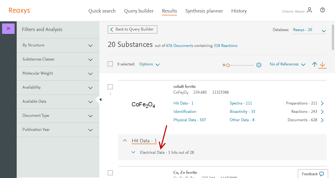 The Results Page is displayed showing 20 Substances - Under Hit Data, expand Electrical Data