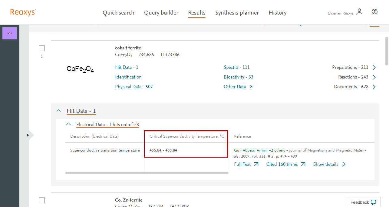 Electrical Data with information for superconductivity > 100°C are highlighted - Click Show details to view the Document Record in Reaxys for the original article.