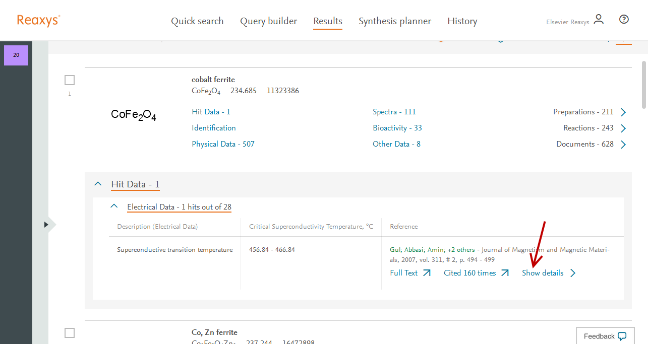 - Click ‘Show details’ to view the Document Record in Reaxys for the original article.