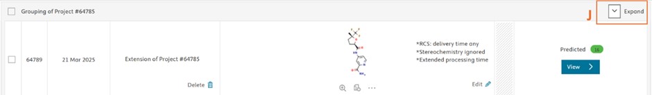 The results of the original and extended projects are grouped for easier navigation. All projects within a group can be made visible by clicking “Expand” button (J).