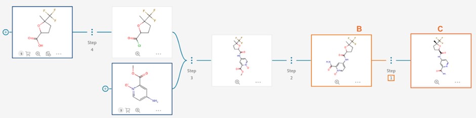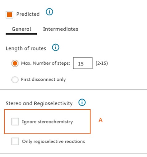 We have introduced an “Ignore Stereochemistry” checkbox (A) for users who wish to bypass molecular stereochemistry considerations. When selected, this option allows Reaxys Predictive Retrosynthesis to search for routes without regard to the stereochemistry of intermediates and building blocks. Please note that despite the predicted intermediate and building blocks in the route will be shown achiral (B), users will still see the target compound with specified stereoinformation (C), which however is ignored in synthesis route planning.