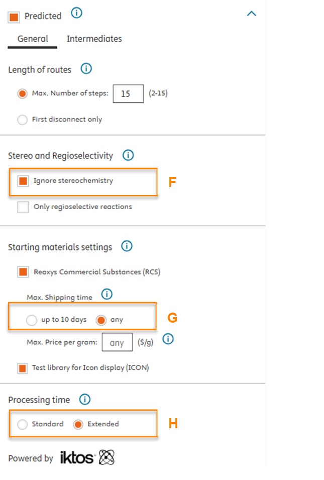 In the event of no results, the default settings are automatically changed to extended parameters to increase the likelihood of obtaining a predicted synthesis route. In summary, the extended parameters will be modified as follows: