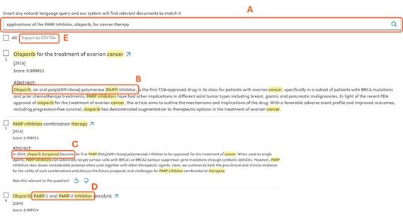Search for “application of the PARP inhibitor Olaparib for cancer therapy” (A) and get results that include the exact terms (B), recognized synonyms (C), and relevant variations (D). You can easily export the search results as a CSV file (E) for further use.