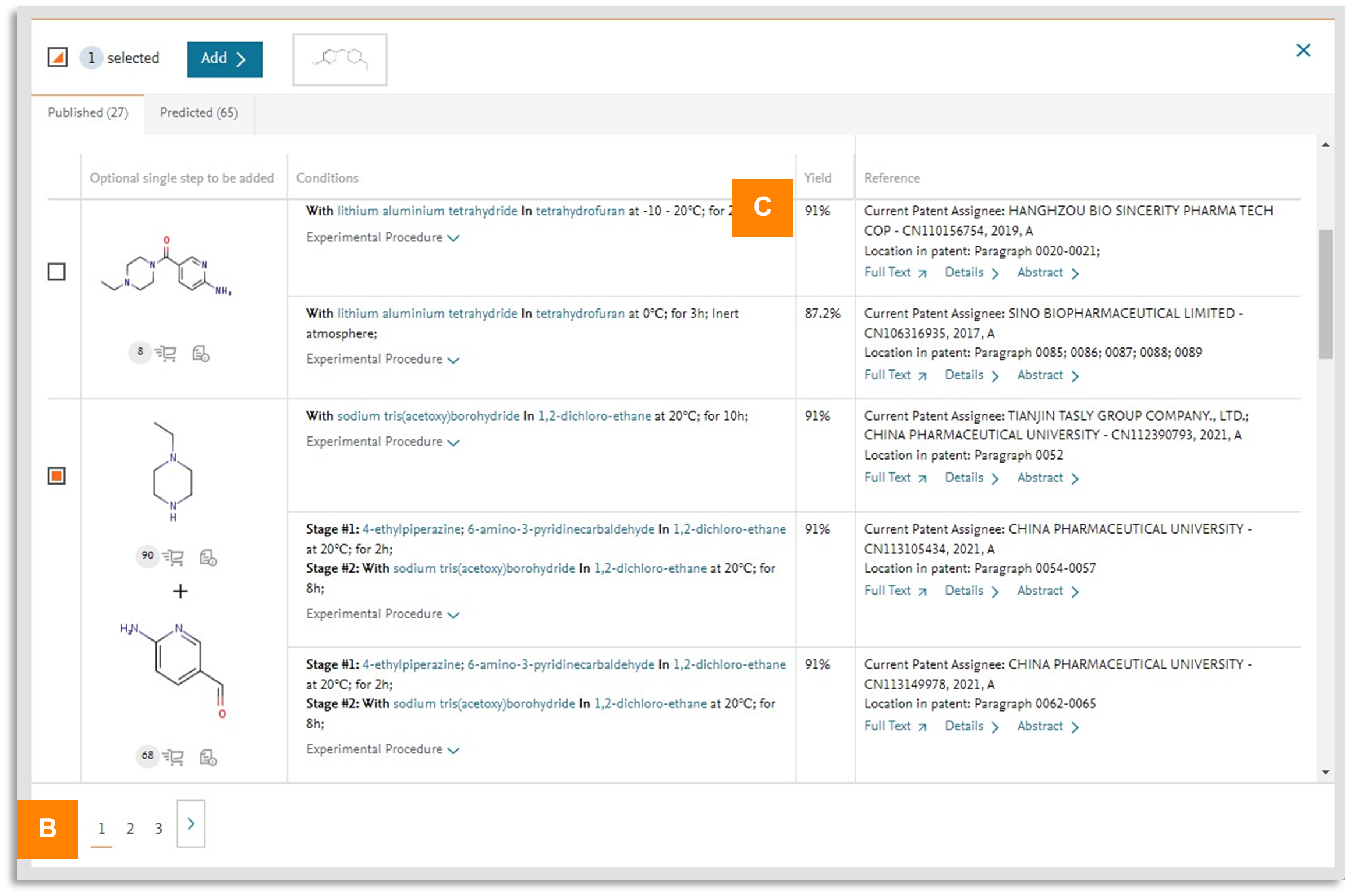 Yield based sorting of published reaction step: To review example reactions effectively, published reaction step(s) will be sorted by decreasing yields (C), so users will be able to select reaction step(s) with highest yield first.