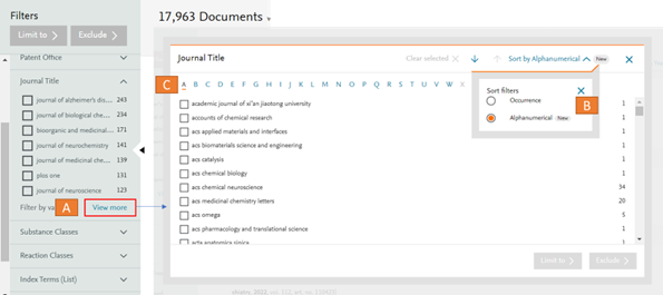 Within the journal title filter you will see the ‘View more’ option (A). This exposes all the journals present in your results page. The new option (B) allows you to sort the journal titles with a ‘New’ Alphanumerical option. This allows you to jump to your journal of interest, based on the first letter of its title (C).