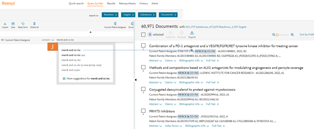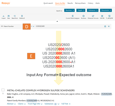 This ability to recognize different patent number formats has been available via Quick Search already. This enhancement is now enabled via the query builder to provide a more complete user experience. Using the patent number querylet (D) you can enter any format of a patent number (E) and Reaxys will recognize this and present you with the document with ease.