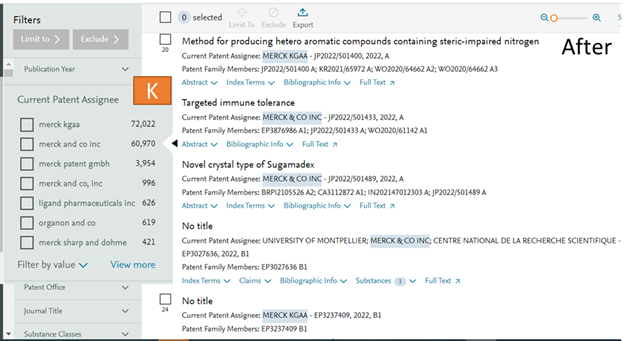 The ampersand (&) symbol or ‘and’ in a patent assignee (eg Merck & co inc, Johnson and Johnson, etc) both were not being considered when only one of these were being used in a search. It is now possible to search either Merck & co inc or Merck and co inc and you will retrieve the same number of results (J).