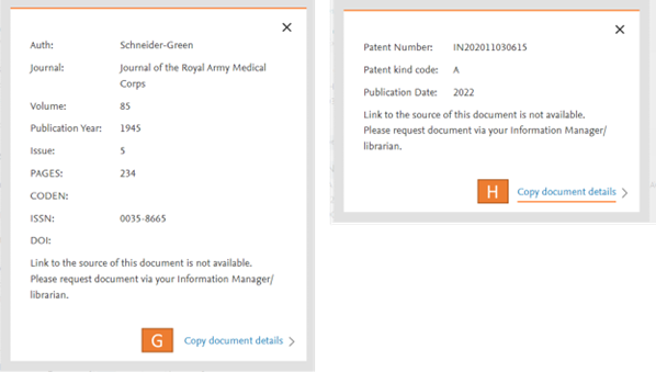 If the source of a document, article (G) or patent (H) is not reachable, it is now possible to capture the reference details and paste this into a document or email, which can be used to source the documents from alternative routes.